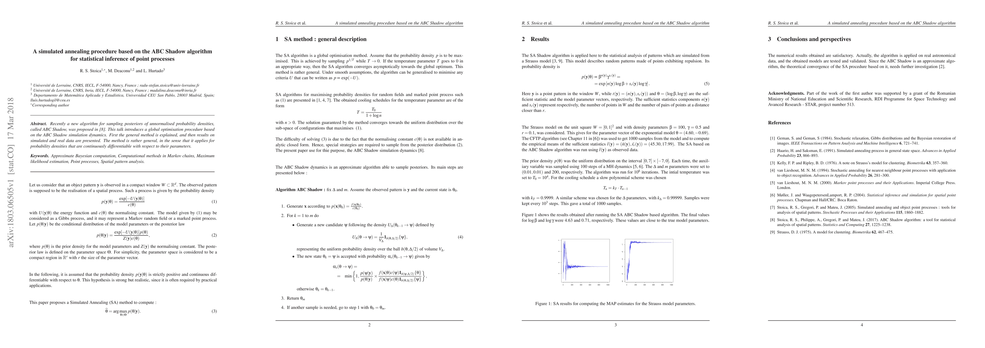 Recently a new algorithm for sampling posteriors of unnormalised probability densities, called ABC Shadow, was proposed in [8]. This talk introduces a global optimisation procedure based on the ABC Shadow simulation dynamics. First the general method is explained, and then results on simulated and real data are presented. The method is rather general, in the sense that it applies for probability densities that are continuously differentiable with respect to their parameters