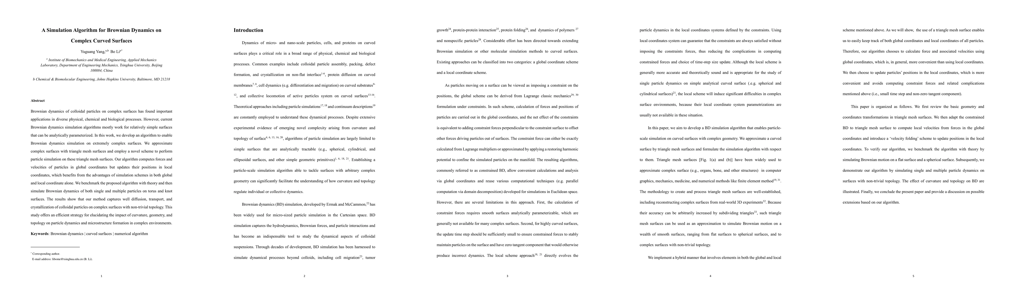 This paper presents a new algorithm for simulating Brownian dynamics on complex curved surfaces using triangle mesh approximations. The method efficiently computes forces in global coordinates while updating particle positions locally, demonstrating accurate simulation of colloidal particle behavior on surfaces like tori and knots.
