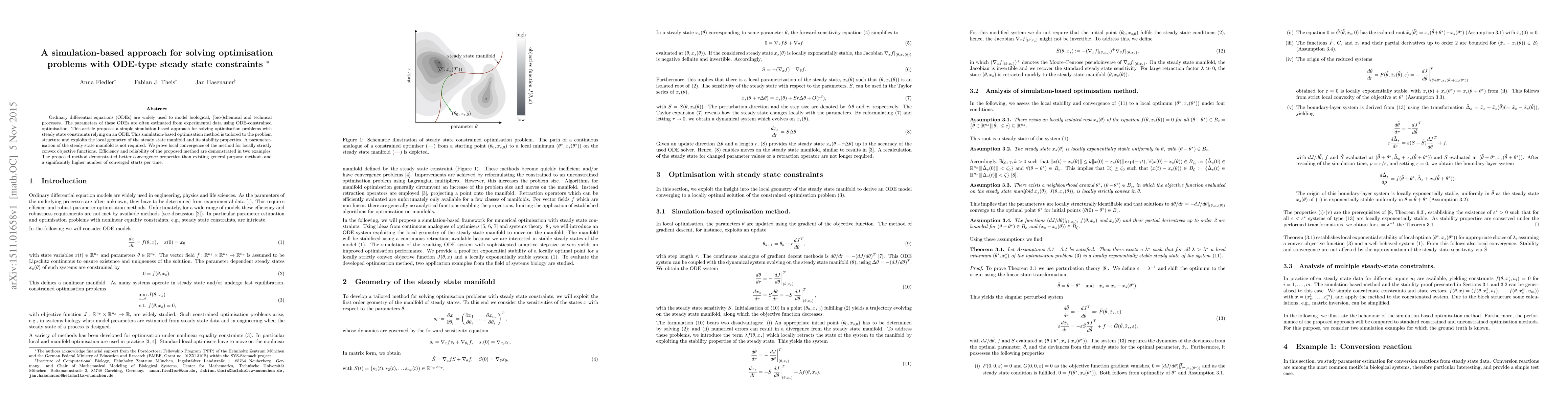 Ordinary differential equations (ODEs) are widely used to model biological, (bio-)chemical and technical processes. The parameters of these ODEs are often estimated from experimental data using ODE-constrained optimisation. This article proposes a simple simulation-based approach for solving optimisation problems with steady state constraints relying on an ODE. This simulation-based optimisation method is tailored to the problem structure and exploits the local geometry of the steady state manifold and its stability properties. A parameterisation of the steady state manifold is not required. We prove local convergence of the method for locally strictly convex objective functions. Effciency and reliability of the proposed method are demonstrated in two examples. The proposed method demonstrated better convergence properties than existing general purpose methods and a significantly higher number of converged starts per time.
