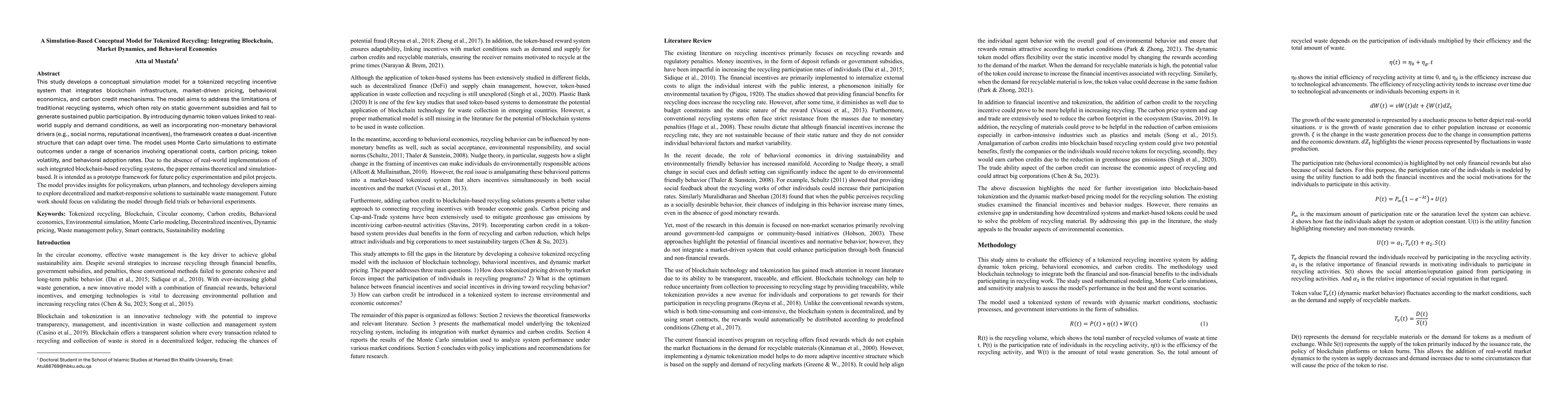 This study develops a conceptual simulation model for a tokenized recycling incentive system that integrates blockchain infrastructure, market-driven pricing, behavioral economics, and carbon credit mechanisms. The model aims to address the limitations of traditional recycling systems, which often rely on static government subsidies and fail to generate sustained public participation. By introducing dynamic token values linked to real-world supply and demand conditions, as well as incorporating non-monetary behavioral drivers (e.g., social norms, reputational incentives), the framework creates a dual-incentive structure that can adapt over time. The model uses Monte Carlo simulations to estimate outcomes under a range of scenarios involving operational costs, carbon pricing, token volatility, and behavioral adoption rates. Due to the absence of real-world implementations of such integrated blockchain-based recycling systems, the paper remains theoretical and simulation-based. It is intended as a prototype framework for future policy experimentation and pilot projects. The model provides insights for policymakers, urban planners, and technology developers aiming to explore decentralized and market-responsive solutions to sustainable waste management. Future work should focus on validating the model through field trials or behavioral experiments.