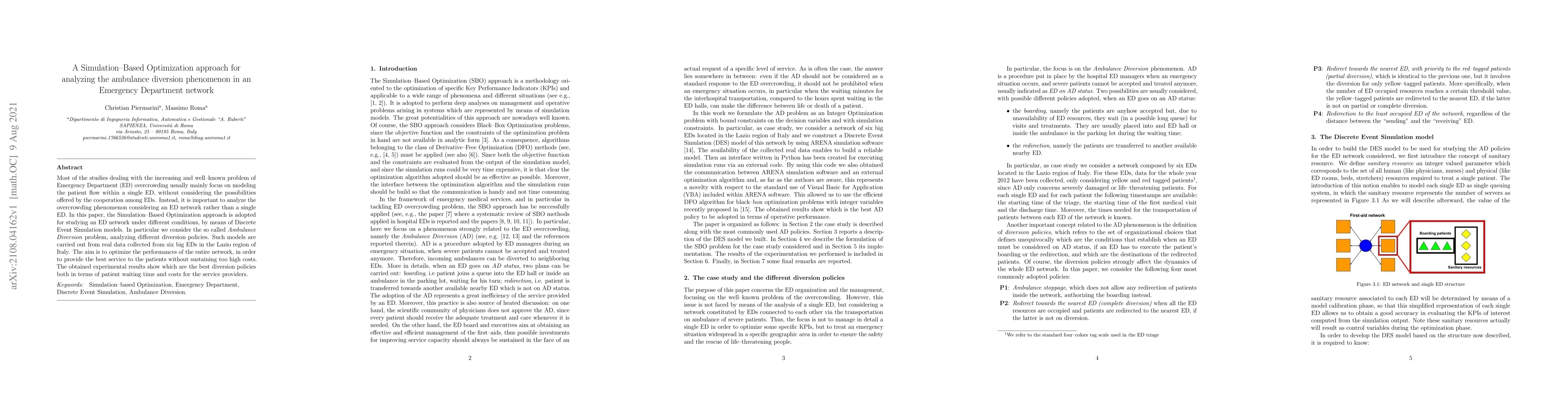This paper employs a Simulation-Based Optimization approach to analyze ambulance diversion in an Emergency Department network, using Discrete Event Simulation models based on real data from six EDs in Italy. The study identifies optimal diversion policies that minimize patient waiting times and service provider costs.