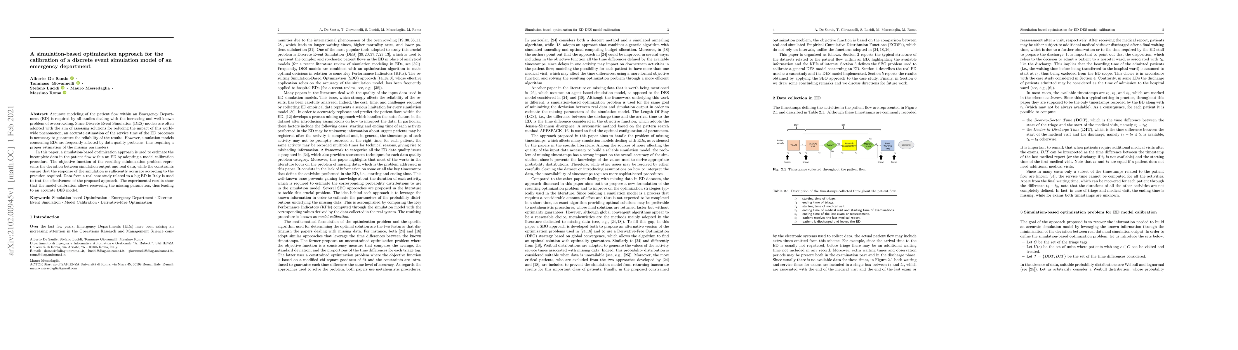 Accurate modeling of the patient flow within an Emergency Department (ED) is required by all studies dealing with the increasing and well-known problem of overcrowding. Since Discrete Event Simulation (DES) models are often adopted with the aim of assessing solutions for reducing the impact of this worldwide phenomenon, an accurate estimation of the service time of the ED processes is necessary to guarantee the reliability of the results. However, simulation models concerning EDs are frequently affected by data quality problems, thus requiring a proper estimation of the missing parameters. In this paper, a simulation-based optimization approach is used to estimate the incomplete data in the patient flow within an ED by adopting a model calibration procedure. The objective function of the resulting minimization problem represents the deviation between simulation output and real data, while the constraints ensure that the response of the simulation is sufficiently accurate according to the precision required. Data from a real case study related to a big ED in Italy is used to test the effectiveness of the proposed approach. The experimental results show that the model calibration allows recovering the missing parameters, thus leading to an accurate DES model.