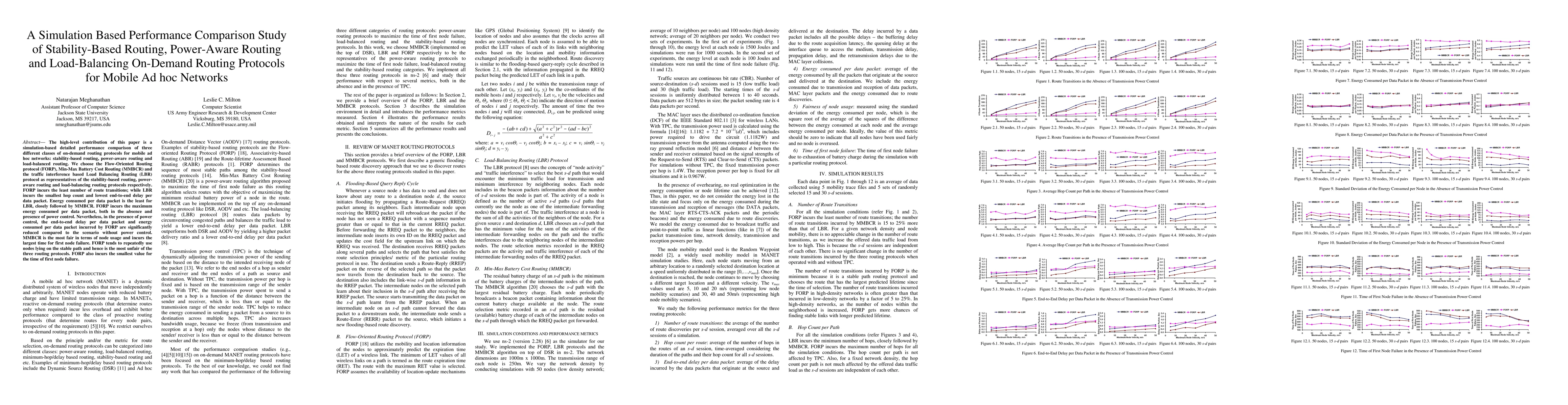 This paper conducts a simulation-based performance comparison of three on-demand routing protocols for mobile ad hoc networks: stability-based, power-aware, and load-balancing. The study finds that Flow-Oriented Routing Protocol (FORP) minimizes route transitions but consumes the most energy, while Load Balancing Routing (LBR) minimizes hop count and delay, and has the least energy consumption per packet. Min-Max Battery Cost Routing (MMBCR) is the most fair in node usage.