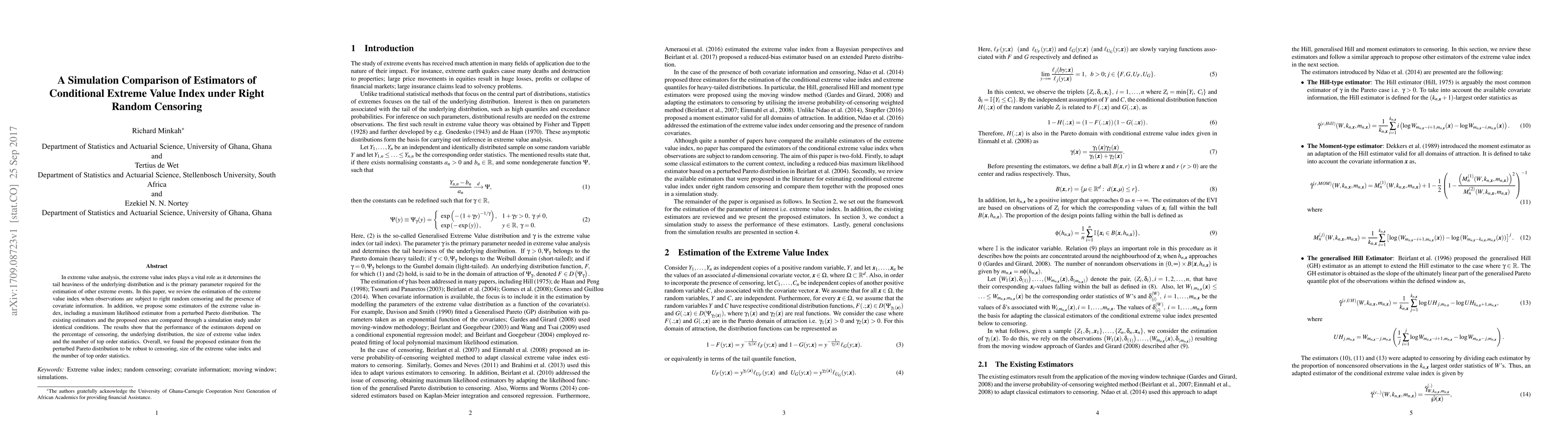In extreme value analysis, the extreme value index plays a vital role as it determines the tail heaviness of the underlying distribution and is the primary parameter required for the estimation of other extreme events. In this paper, we review the estimation of the extreme value index when observations are subject to right random censoring and the presence of covariate information. In addition, we propose some estimators of the extreme value index, including a maximum likelihood estimator from a perturbed Pareto distribution. The existing estimators and the proposed ones are compared through a simulation study under identical conditions. The results show that the performance of the estimators depend on the percentage of censoring, the underlying distribution, the size of extreme value index and the number of top order statistics. Overall, we found the proposed estimator from the perturbed Pareto distribution to be robust to censoring, size of the extreme value index and the number of top order statistics.