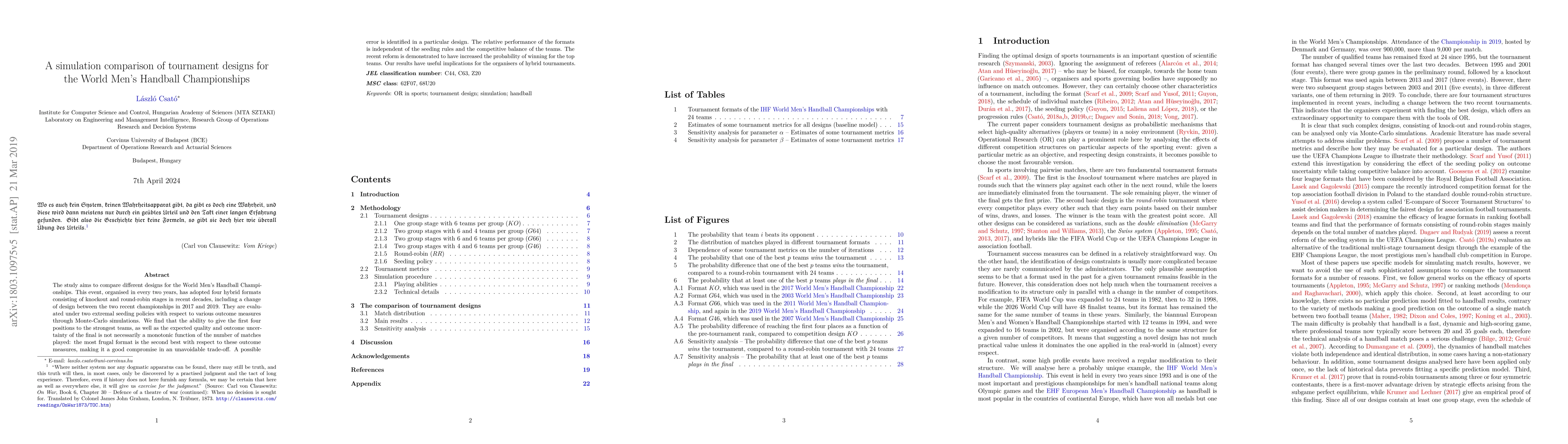 The study compares various tournament designs for the World Men's Handball Championships using Monte-Carlo simulations, finding that the most frugal format offers a good compromise despite not always maximizing the number of matches. The recent design change has increased the winning chances for top teams, providing valuable insights for tournament organizers.