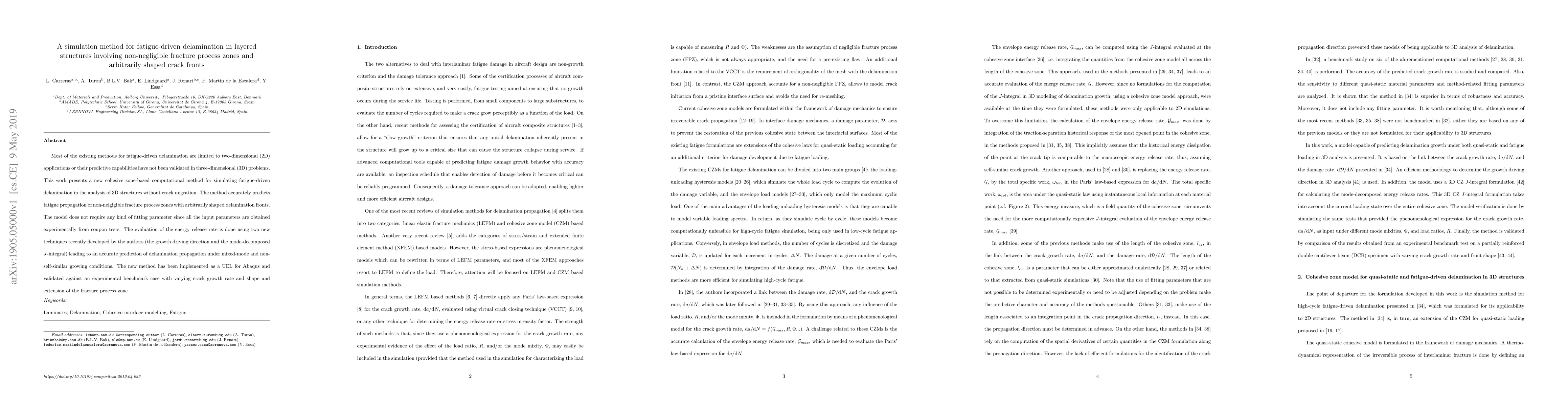 This paper introduces a new cohesive zone-based computational method for simulating fatigue-driven delamination in 3D layered structures, accurately predicting fracture process zones and arbitrarily shaped crack fronts without requiring fitting parameters. The method is validated against experimental data using novel energy release rate evaluation techniques.