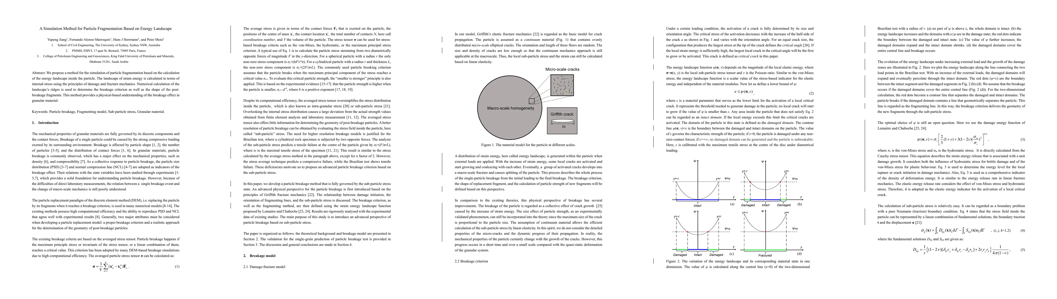 We propose a method for the simulation of particle fragmentation based on the calculation of the energy landscape inside the particle. The landscape of strain energy is calculated in terms of internal stress using the principles of damage and fracture mechanics. Numerical calculation of the landscape s ridges is used to determine the breakage criterion as well as the shape of the postbreakage fragments. This method provides a physical-based understanding of the breakage effect in granular material.
