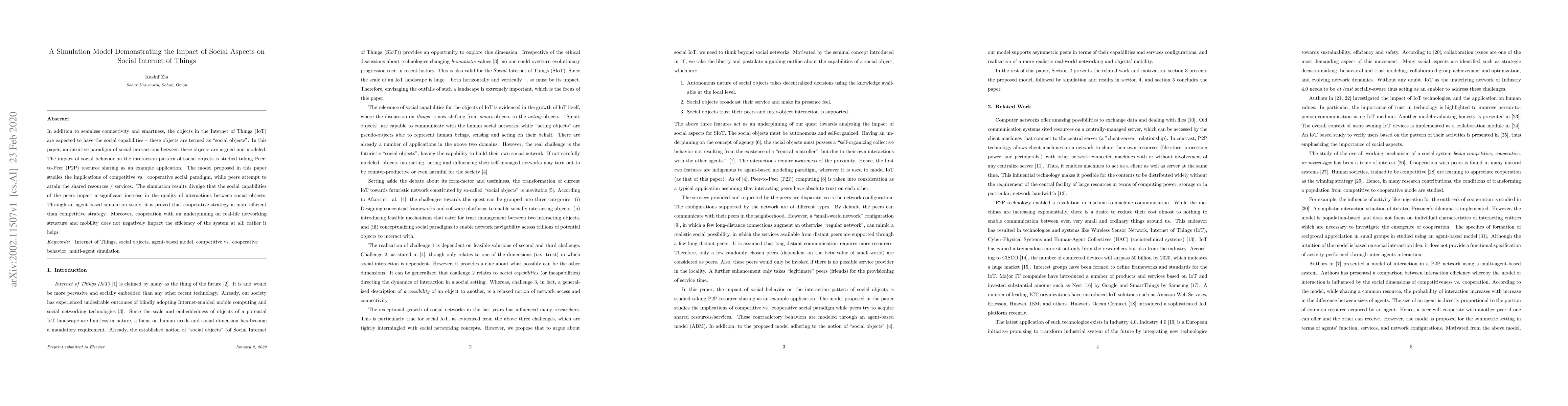 In addition to seamless connectivity and smartness, the objects in the Internet of Things (IoT) are expected to have the social capabilities -- these objects are termed as ``social objects''. In this paper, an intuitive paradigm of social interactions between these objects are argued and modeled. The impact of social behavior on the interaction pattern of social objects is studied taking Peer-to-Peer (P2P) resource sharing as an example application. The model proposed in this paper studies the implications of competitive vs. cooperative social paradigm, while peers attempt to attain the shared resources / services. The simulation results divulge that the social capabilities of the peers impart a significant increase in the quality of interactions between social objects. Through an agent-based simulation study, it is proved that cooperative strategy is more efficient than competitive strategy. Moreover, cooperation with an underpinning on real-life networking structure and mobility does not negatively impact the efficiency of the system at all; rather it helps.