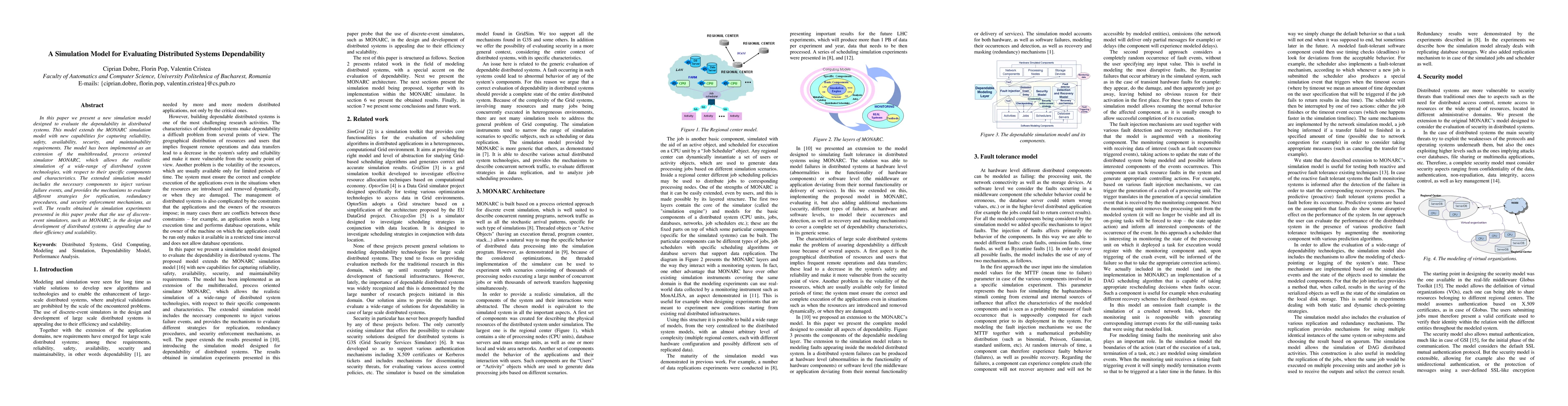In this paper we present a new simulation model designed to evaluate the dependability in distributed systems. This model extends the MONARC simulation model with new capabilities for capturing reliability, safety, availability, security, and maintainability requirements. The model has been implemented as an extension of the multithreaded, process oriented simulator MONARC, which allows the realistic simulation of a wide-range of distributed system technologies, with respect to their specific components and characteristics. The extended simulation model includes the necessary components to inject various failure events, and provides the mechanisms to evaluate different strategies for replication, redundancy procedures, and security enforcement mechanisms, as well. The results obtained in simulation experiments presented in this paper probe that the use of discrete-event simulators, such as MONARC, in the design and development of distributed systems is appealing due to their efficiency and scalability.