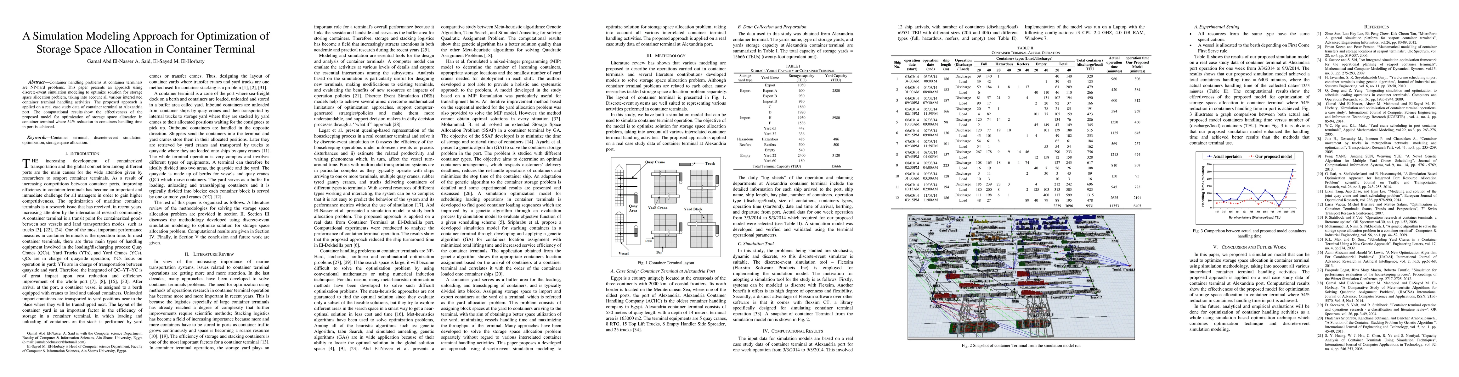 This paper proposes a discrete-event simulation modeling approach to optimize storage space allocation in container terminals, demonstrating significant reductions in handling time through a case study at Alexandria port. The model effectively integrates various interrelated terminal activities, achieving a 54% reduction in container handling time.