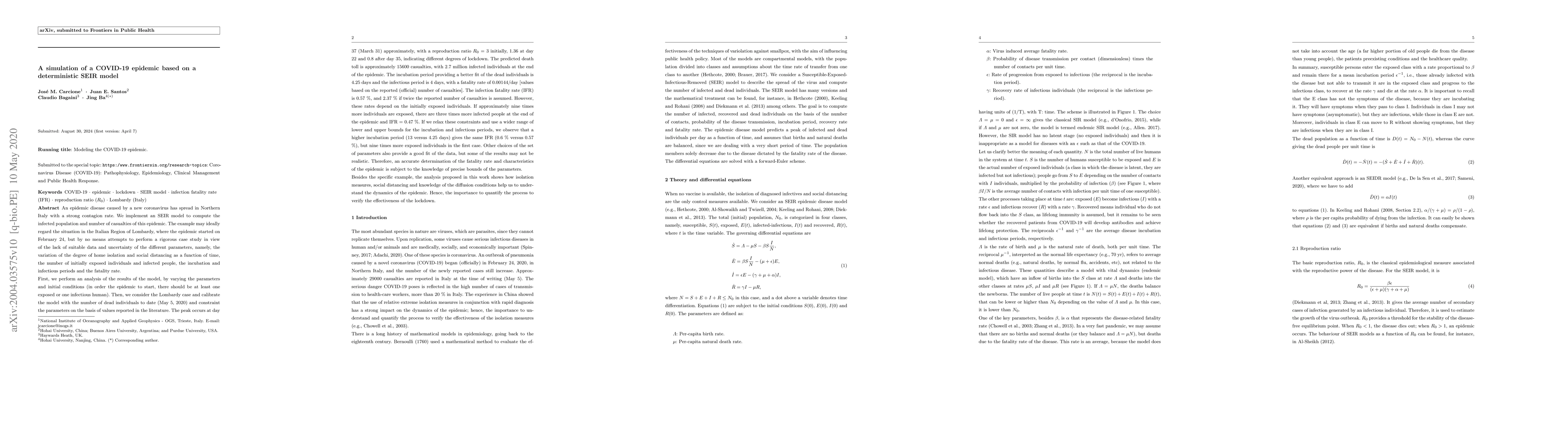 This research uses a deterministic SEIR model to simulate a COVID-19 epidemic in Northern Italy, predicting around 15,600 deaths and 2.7 million infections by end of the epidemic. The model suggests an initial R0 of 3, decreasing to 0.8 post-lockdown, with a fatality rate of 0.57% (varying to 0.47% with adjusted exposure figures). Precise fatality rate determination depends on understanding epidemic characteristics.