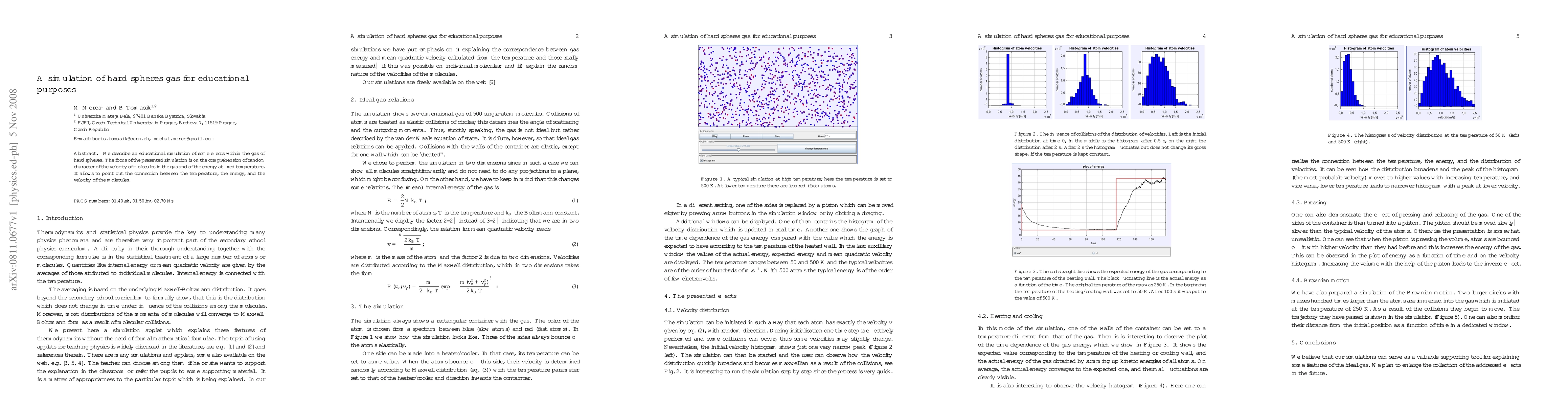 A simulation of a hard spheres gas is created for educational purposes to demonstrate the random nature of molecule velocities and their connection to temperature and energy at fixed temperatures.