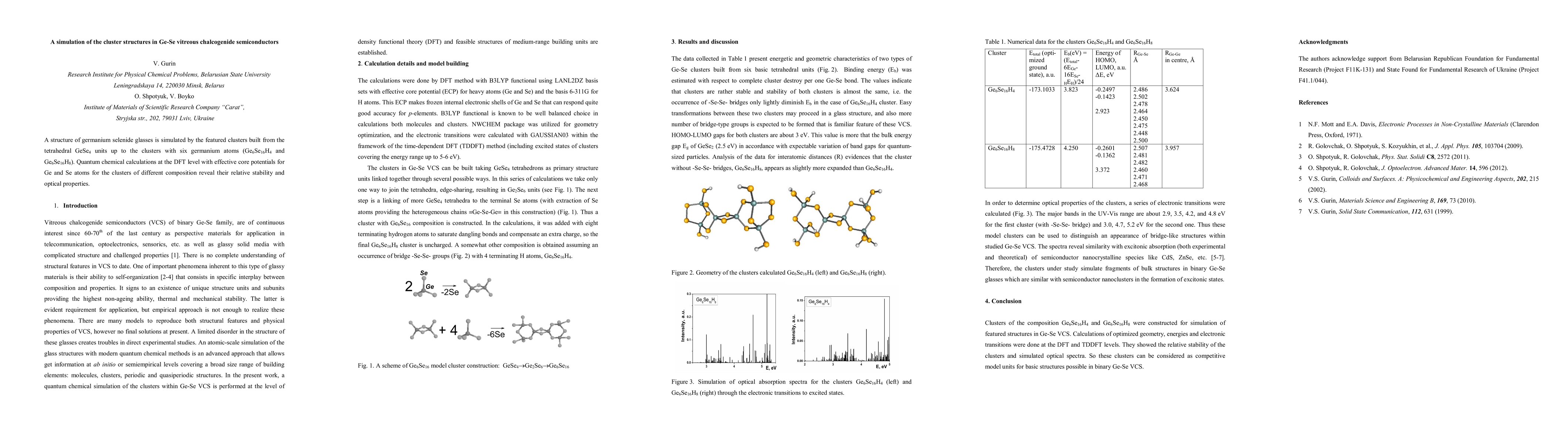 This paper simulates the cluster structures in germanium selenide glasses, focusing on tetrahedral GeSe4 units forming clusters up to Ge6Se16H4 and Ge6Se16H8. Quantum chemical calculations at the DFT level reveal the relative stability and optical properties of these clusters.
