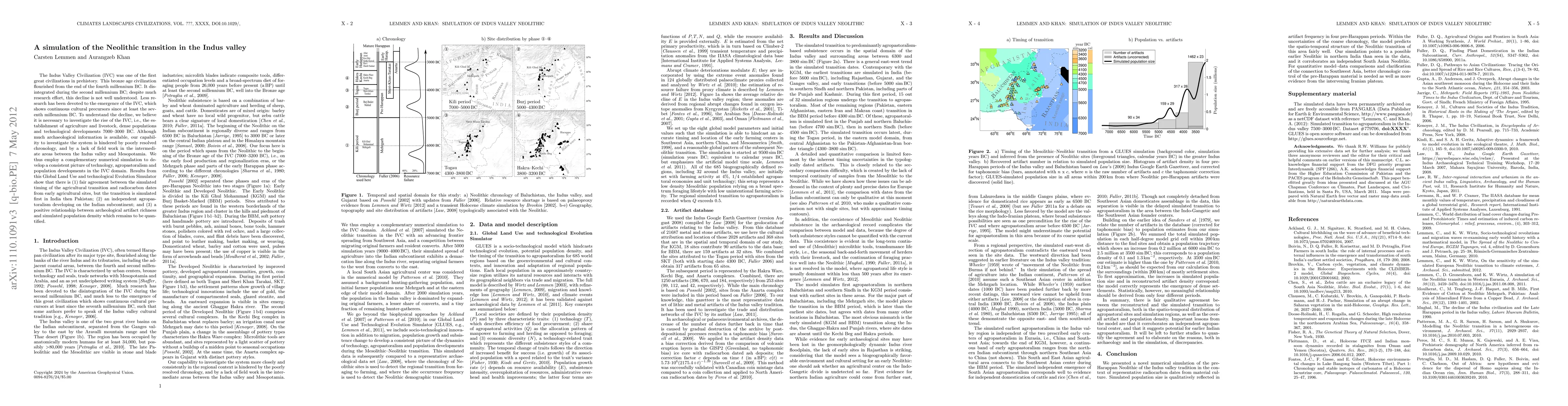 The Indus Valley Civilization (IVC) was one of the first great civilizations in prehistory. This bronze age civilization flourished from the end of the fourth millennium BC. It disintegrated during the second millennium BC; despite much research effort, this decline is not well understood. Less research has been devoted to the emergence of the IVC, which shows continuous cultural precursors since at least the seventh millennium BC. To understand the decline, we believe it is necessary to investigate the rise of the IVC, i.e., the establishment of agriculture and livestock, dense populations and technological developments 7000--3000 BC. Although much archaeological information is available, our capability to investigate the system is hindered by poorly resolved chronology, and by a lack of field work in the intermediate areas between the Indus valley and Mesopotamia. We thus employ a complementary numerical simulation to develop a consistent picture of technology, agropastoralism and population developments in the IVC domain. Results from this Global Land Use and technological Evolution Simulator show that there is (1) fair agreement between the simulated timing of the agricultural transition and radiocarbon dates from early agricultural sites, but the transition is simulated first in India then Pakistan; (2) an independent agropastoralism developing on the Indian subcontinent; and (3) a positive relationship between archeological artifact richness and simulated population density which remains to be quantified.