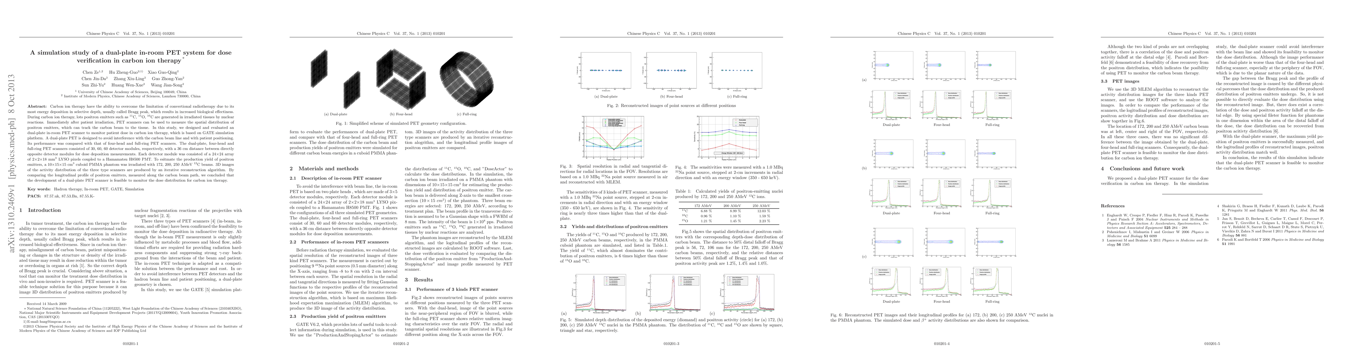 Carbon ion therapy have the ability to overcome the limitation of convertional radiotherapy due to its most energy deposition in selective depth, usually called Bragg peak, which results in increased biological effectiness. During carbon ion therapy, lots positron emitters such as $^{11}$C, $^{15}$O, $^{10}$C are generated in irradiated tissues by nuclear reactions. Immediately after patient irradiation, PET scanners can be used to measure the spatial distribution of positron emitters, which can track the carbon beam to the tissue. In this study, we designed and evaluated an dual-plate in-room PET scanner to monitor patient dose in carbon ion therapy, which is based on GATE simulation platform. A dual-plate PET is designed to avoid interference with the carbon beam line and with patient positioning. Its performance was compared with that of four-head and full-ring PET scanners. The dual-plate, four-head and full-ring PET scanners consisted of 30, 60, 60 detector modules, respectively, with a 36 cm distance between directly opposite detector modules for dose deposition measurements. Each detector module was consisted of a 24$\times$24 array of 2$\times2\times$18 mm$^{3}$ LYSO pixels coupled to a Hamamatsu H8500 PMT. To esitmate the production yield of positron emitters, a 10$\times15\times$15 cm$^{3}$ cuboid PMMA phantom was irradiated with 172, 200, 250 AMeV $^{12}$C beams. 3D images of the activity distribution of the three type scanners are produced by an iterative reconstruction algorithm. By comparing the longitudinal profile of positron emitters, measured along the carbon beam path, we concluded that the development of a dual-plate PET scanner is feasible to monitor the dose distribution for carbon ion therapy.