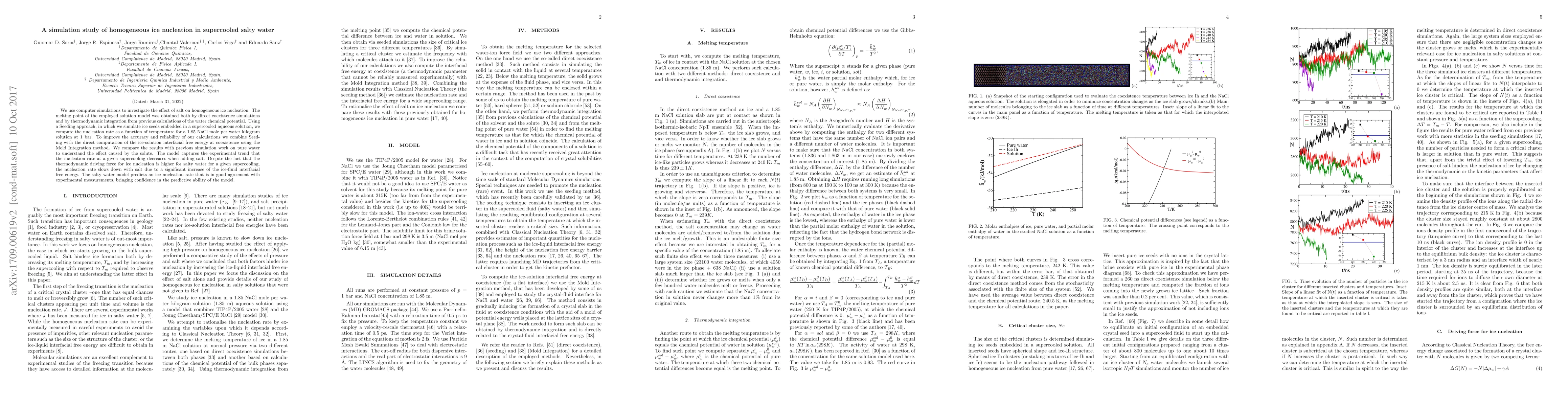 We use computer simulations to investigate the effect of salt on homogeneous ice nucleation. The melting point of the employed solution model was obtained both by direct coexistence simulations and by thermodynamic integration from previous calculations of the water chemical potential. Using a Seeding approach, in which we simulate ice seeds embedded in a supercooled aqueous solution, we compute the nucleation rate as a function of temperature for a 1.85 NaCl mole per water kilogram solution at 1 bar. To improve the accuracy and reliability of our calculations we combine Seeding with the direct computation of the ice-solution interfacial free energy at coexistence using the Mold Integration method. We compare the results with previous simulation work on pure water to understand the effect caused by the solute. The model captures the experimental trend that the nucleation rate at a given supercooling decreases when adding salt. Despite the fact that the thermodynamic driving force for ice nucleation is higher for salty water for a given supercooling, the nucleation rate slows down with salt due to a significant increase of the ice-fluid interfacial free energy. The salty water model predicts an ice nucleation rate that is in good agreement with experimental measurements, bringing confidence in the predictive ability of the model.
