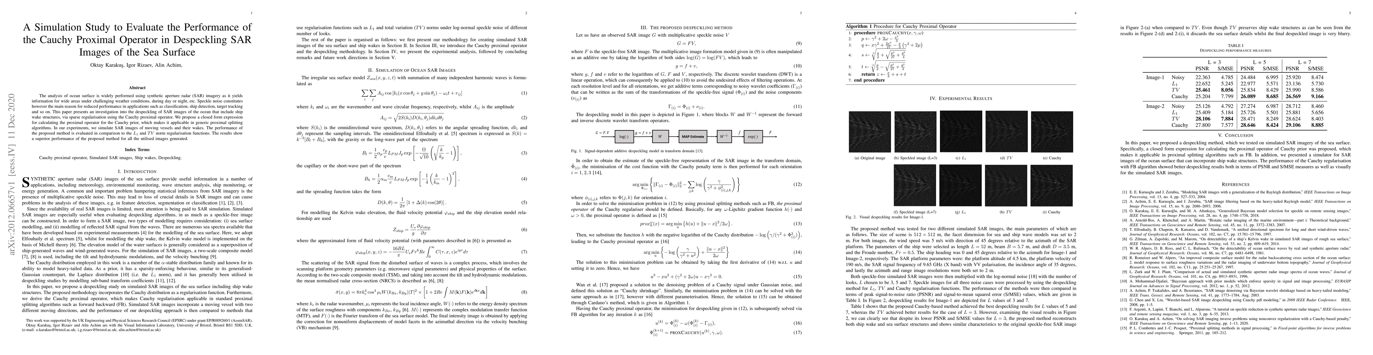 This paper investigates the use of the Cauchy proximal operator for despeckling synthetic aperture radar (SAR) images of the sea surface, proposing a closed-form expression for its calculation. Experimental results show that the proposed method outperforms L1 and total variation norm regularisation in improving image quality.