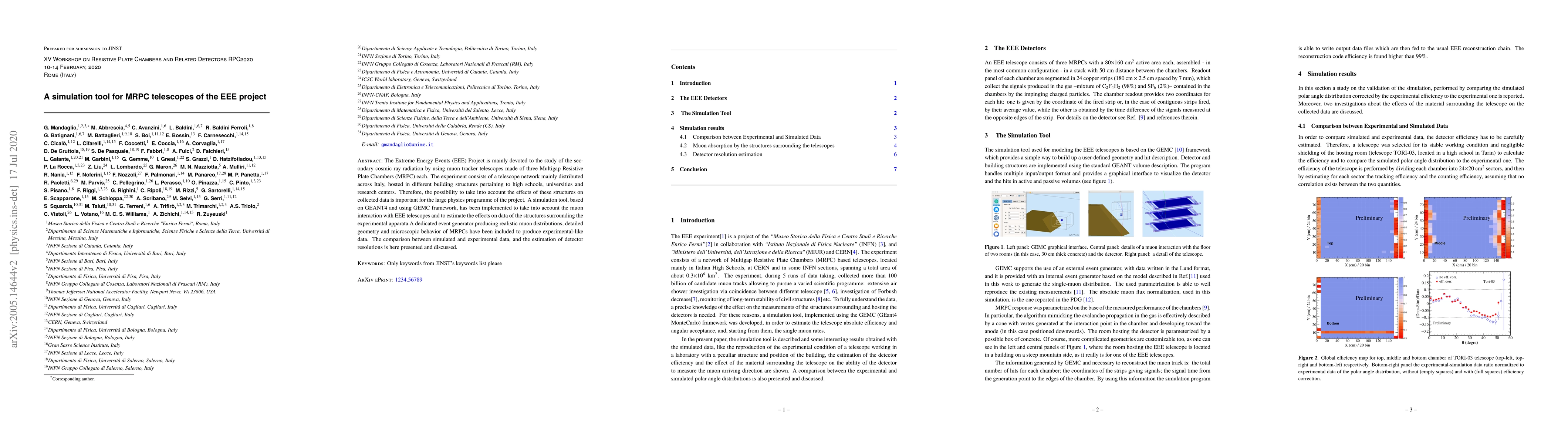 This paper presents a GEANT4-based simulation tool for MRPC telescopes in the EEE Project, aiming to study secondary cosmic rays. The tool estimates the effects of surrounding structures on data and includes a dedicated event generator for realistic muon distributions.