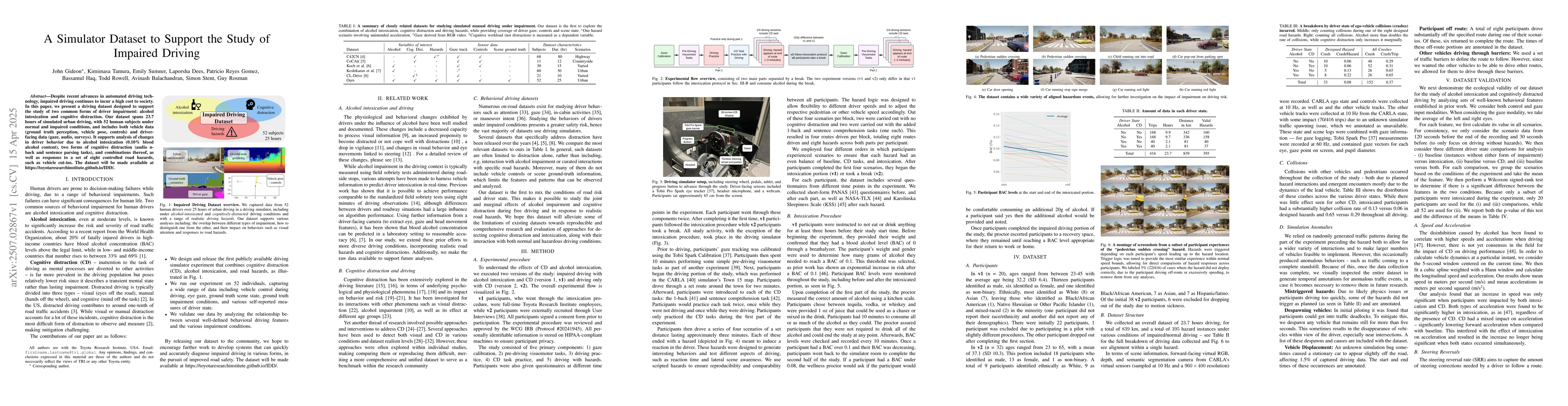 This paper introduces a simulated driving dataset to study impaired driving, covering 23.7 hours of urban driving with 52 subjects under normal and impaired conditions. It includes vehicle and driver-facing data for analyzing impacts of alcohol intoxication and cognitive distraction, with responses to road hazards, available at provided link.