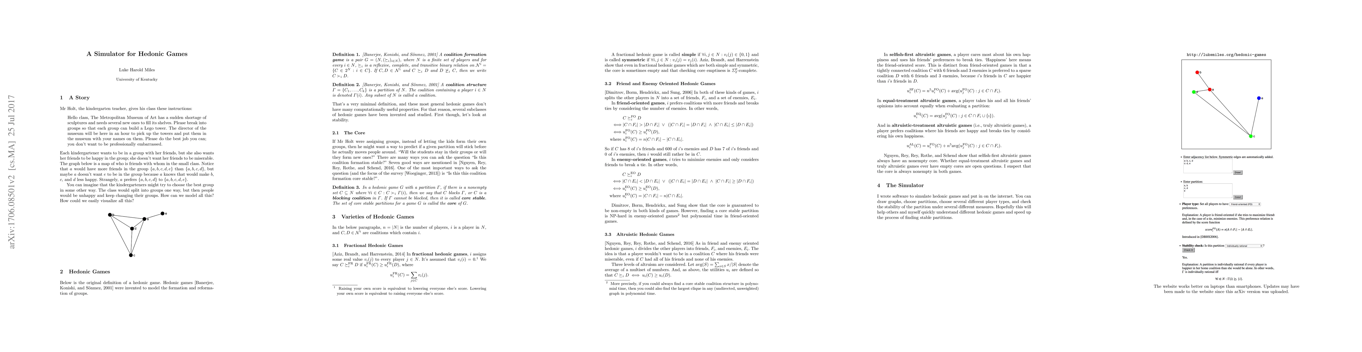 Hedonic games are meant to model how coalitions of people form and break apart in the real world. However, it is difficult to run simulations when everything must be done by hand on paper. We present an online software that allows fast and visual simulation of several types of hedonic games. http://lukemiles.org/hedonic-games/