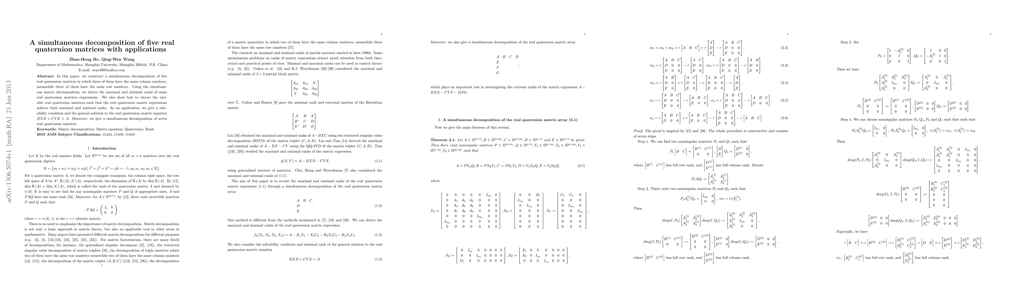 This paper develops a simultaneous decomposition method for five real quaternion matrices, determining maximal and minimal ranks, and applying it to derive a solvability condition and the general solution for the equation $BXD+CYE=A$. It also extends the method to decompose seven matrices.