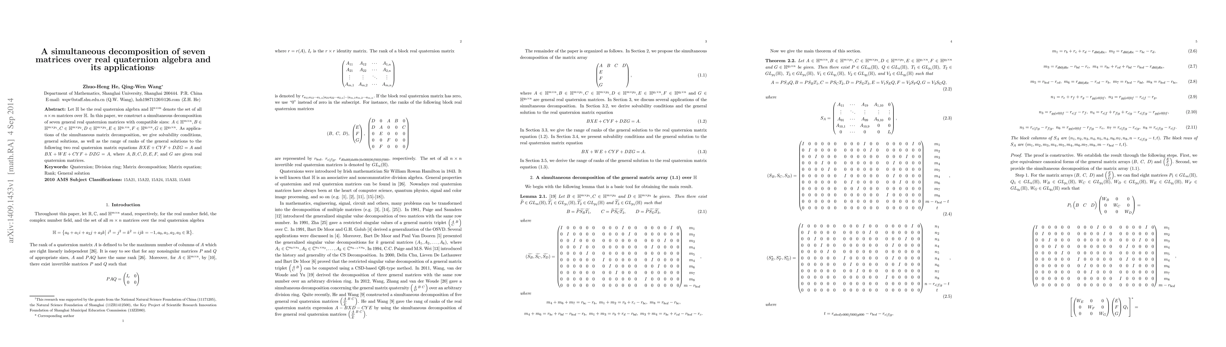 This paper presents a simultaneous decomposition method for seven real quaternion matrices, exploring their solvability conditions and ranks for two specific matrix equations. The results provide insights into the solvability and structure of solutions involving these matrices.
