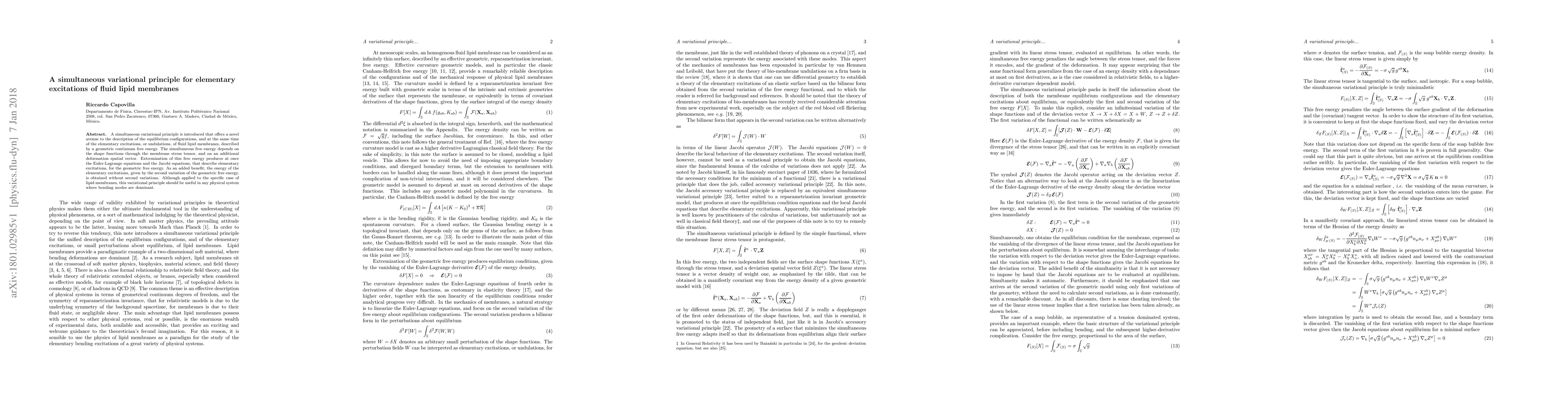 A simultaneous variational principle is introduced that offers a novel avenue to the description of the equilibrium configurations, and at the same time of the elementary excitations, or undulations, of fluid lipid membranes, described by a geometric continuum free energy. The simultaneous free energy depends on the shape functions through the membrane stress tensor, and on an additional deformation spatial vector. Extremization of this free energy produces at once the Euler-Lagrange equations and the Jacobi equations, that describe elementary excitations, for the geometric free energy. As an added benefit, the energy of the elementary excitations, given by the second variation of the geometric free energy, is obtained without second variations. Although applied to the specific case of lipid membranes, this variational principle should be useful in any physical system where bending modes are dominant.