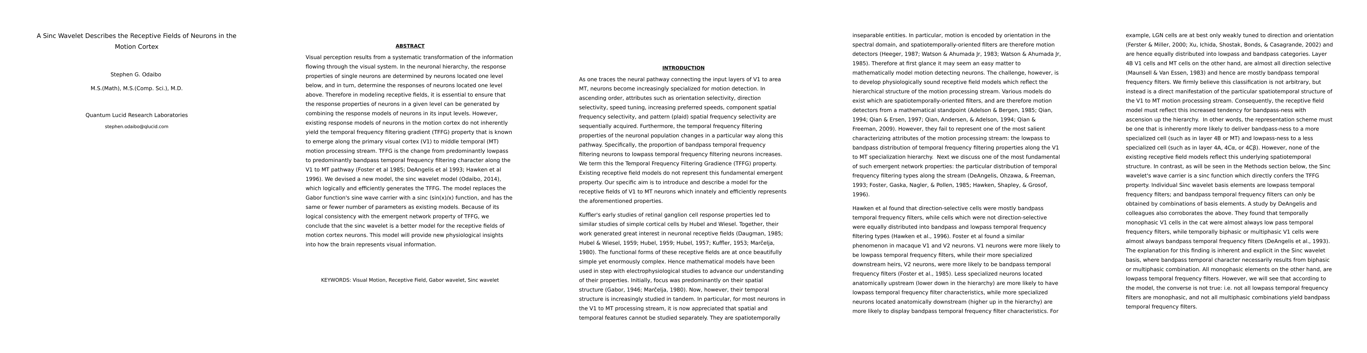 The paper proposes a sinc wavelet model to describe the receptive fields of neurons in the motion cortex, which better captures the temporal frequency filtering gradient (TFFG) compared to existing models. The sinc wavelet replaces the Gabor function's sine wave carrier with a sinc function, offering logical consistency with the TFFG property observed in the visual processing pathway.