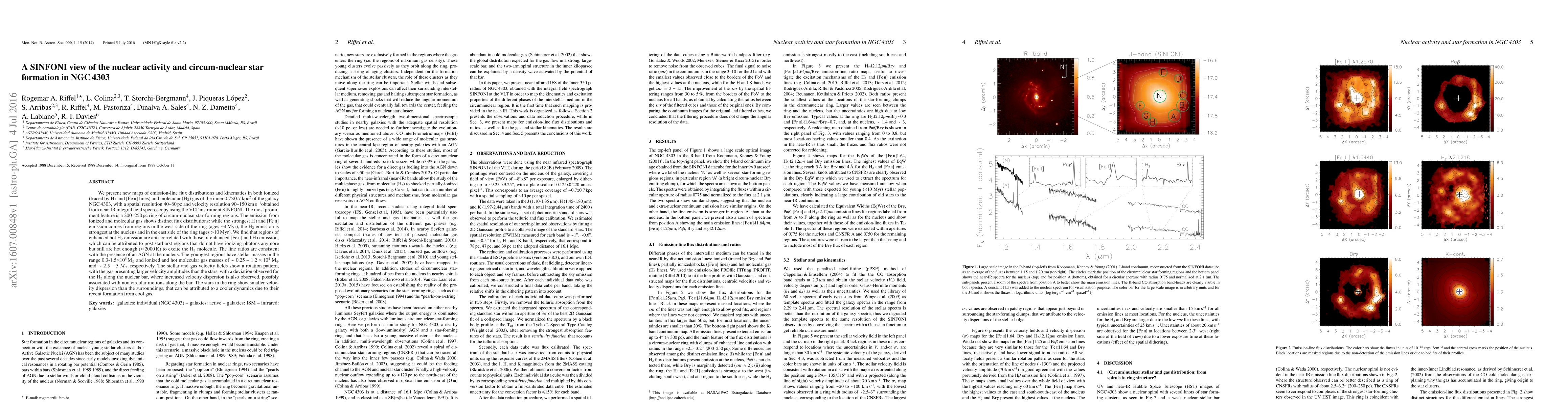 We present new maps of emission-line flux distributions and kinematics in both ionized (traced by HI and [FeII] lines) and molecular (H2) gas of the inner 0.7x0.7kpc2 of the galaxy NGC4303, with a spatial resolution 40-80pc and velocity resolution 90-150 km/s obtained from near-IR integral field specroscopy using the VLT instrument SINFONI. The most promiment feature is a 200-250pc ring of circum-nuclear star-forming regions. The emission from ionized and molecular gas shows distinct flux distributions: while the strongest HI and [FeII] emission comes from regions in the west side of the ring (ages~4Myr), the H2 emission is strongest at the nucleus and in the east side of the ring (ages>10Myr). We find that regions of enhanced hot H2 emission are anti-correlated with those of enhanced [FeII] and HI emission, which can be attributed to post starburst regions that do not have ionizing photons anymore but still are hot enough (~2000K) to excite the H2 molecule. The line ratios are consistent with the presence of an AGN at the nucleus. The youngest regions have stellar masses in the range 0.3-1.5E5 MSun and ionized and hot molecular gas masses of ~0.25-1.2E4 Msun and 2.5-5 Msun, respectively. The stellar and gas velocity fields show a rotation pattern, with the gas presenting larger velocity amplitudes than the stars, with a deviation observed for the H2 along the nuclear bar, where increased velocity dispersion is also observed, possibly associated with non circular motions along the bar. The stars in the ring show smaller velocity dispersion than the surroundings, that can be attributed to a cooler dynamics due to their recent formation from cool gas.