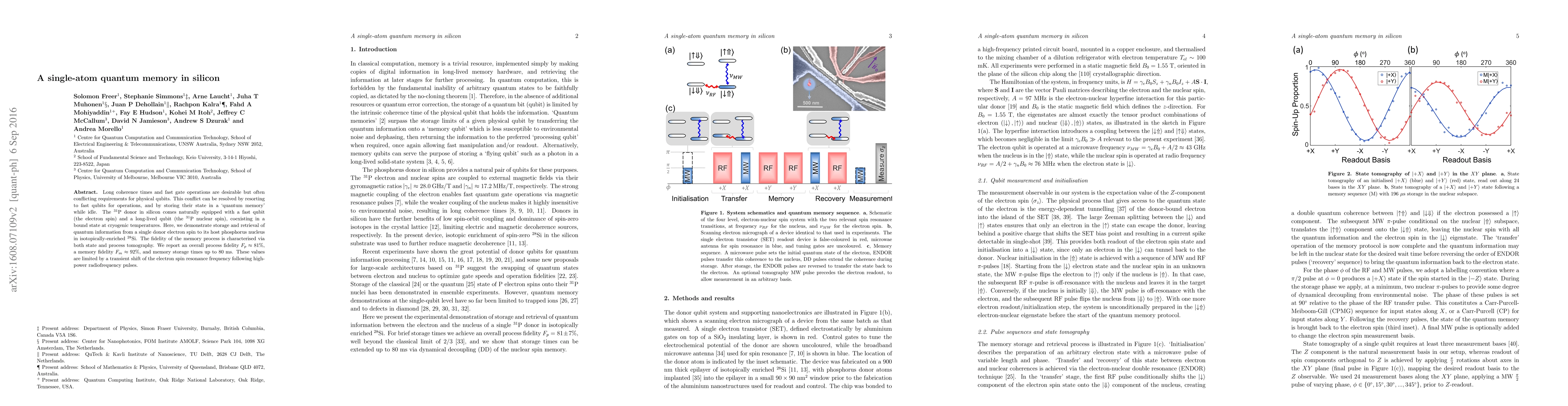 Long coherence times and fast gate operations are desirable but often conflicting requirements for physical qubits. This conflict can be resolved by resorting to fast qubits for operations, and by storing their state in a `quantum memory' while idle. The $^{31}$P donor in silicon comes naturally equipped with a fast qubit (the electron spin) and a long-lived qubit (the $^{31}$P nuclear spin), coexisting in a bound state at cryogenic temperatures. Here, we demonstrate storage and retrieval of quantum information from a single donor electron spin to its host phosphorus nucleus in isotopically-enriched $^{28}$Si. The fidelity of the memory process is characterised via both state and process tomography. We report an overall process fidelity of $F_p =$81${\pm}$7%, a memory fidelity ($F_m$) of over 90%, and memory storage times up to 80 ms. These values are limited by a transient shift of the electron spin resonance frequency following high-power radiofrequency pulses.