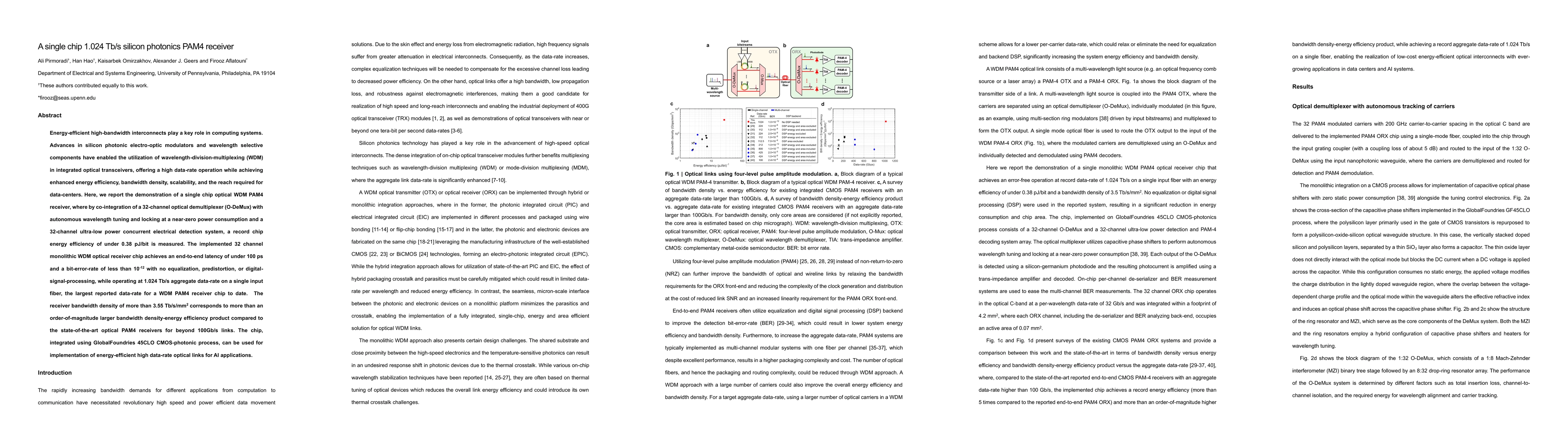 Energy-efficient high-bandwidth interconnects play a key role in computing systems. Advances in silicon photonic electro-optic modulators and wavelength selective components have enabled the utilization of wavelength-division-multiplexing (WDM) in integrated optical transceivers, offering a high data-rate operation while achieving enhanced energy efficiency, bandwidth density, scalability, and the reach required for data-centers. Here, we report the demonstration of a single chip optical WDM PAM4 receiver, where by co-integration of a 32-channel optical demultiplexer (O-DeMux) with autonomous wavelength tuning and locking at a near-zero power consumption and a 32-channel ultra-low power concurrent electrical detection system, a record chip energy efficiency of under 0.38 pJ/bit is measured. The implemented 32 channel monolithic WDM optical receiver chip achieves an end-to-end latency of under 100 ps and a bit-error-rate of less than 10-12 with no equalization, pre-distortion, or digital-signal-processing, while operating at 1.024 Tb/s aggregate data-rate on a single input fiber, the largest reported data-rate for a WDM PAM4 receiver chip to date. The receiver bandwidth density of more than 3.55 Tb/s/mm2 corresponds to more than an order-of-magnitude larger bandwidth density-energy efficiency product compared to the state-of-the-art optical PAM4 receivers for beyond 100Gb/s links. The chip, integrated using GlobalFoundries 45CLO CMOS-photonic process, can be used for implementation of energy-efficient high data-rate optical links for AI applications.
