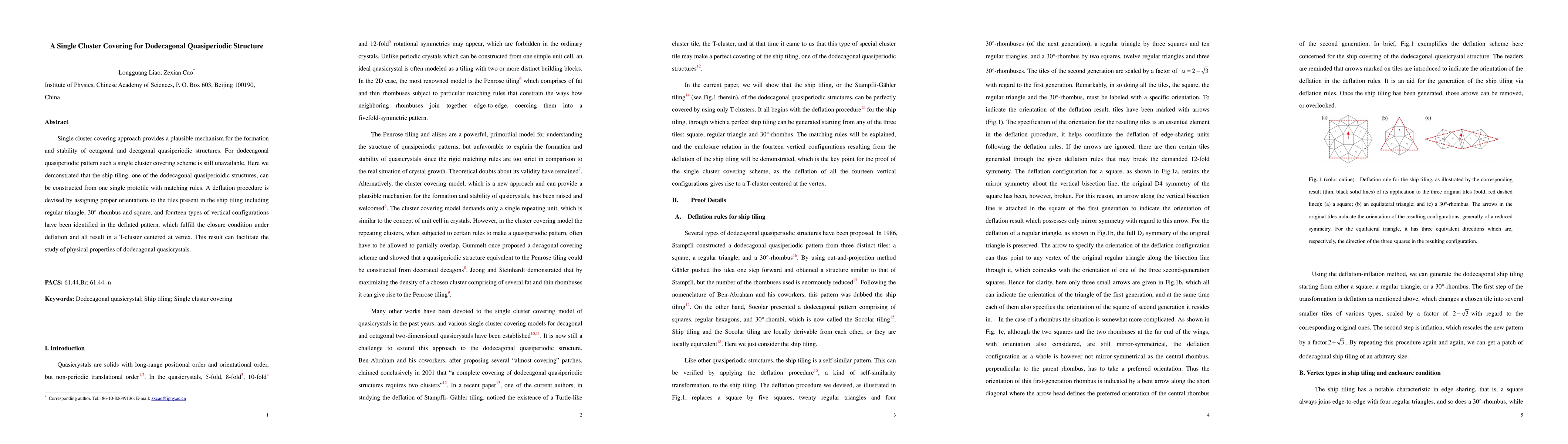 This paper introduces a single cluster covering scheme for the ship tiling, a dodecagonal quasiperiodic structure, constructed from a single prototile with matching rules. The study employs a deflation procedure to assign orientations to various tiles, identifying fourteen vertical configurations that maintain the closure condition, thus aiding the exploration of dodecagonal quasicrystals' physical properties.
