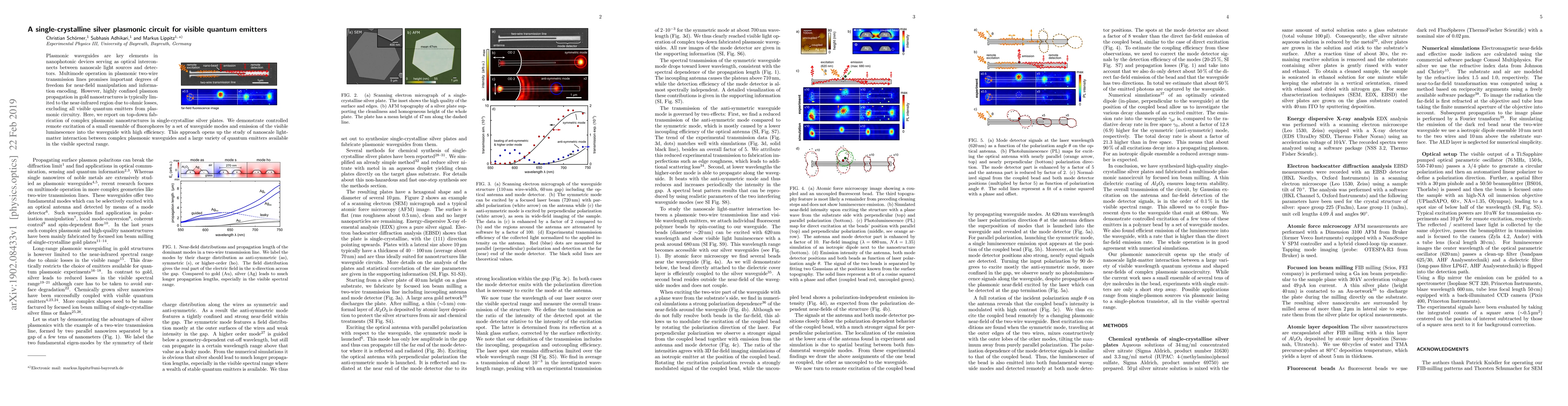 This paper reports the fabrication of single-crystalline silver plasmonic circuits that enable efficient manipulation and information encoding of visible quantum emitters, overcoming the limitations of gold plasmonic structures in the near-infrared region due to ohmic losses. The study demonstrates high-efficiency remote excitation and emission of visible luminescence from fluorophores using these silver plasmonic waveguides.