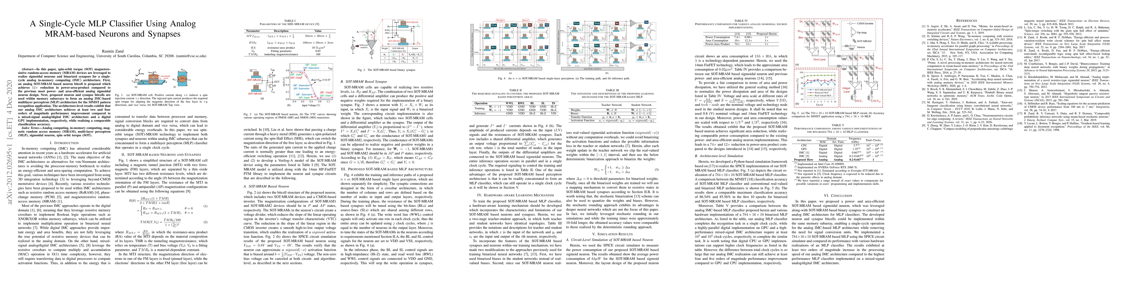 This paper proposes an efficient single-cycle MLP classifier using analog MRAM-based neurons and synapses, achieving a 12x reduction in power-area-product. The architecture demonstrates significant performance improvements over mixed-signal and digital implementations while maintaining comparable classification accuracy for MNIST pattern recognition.