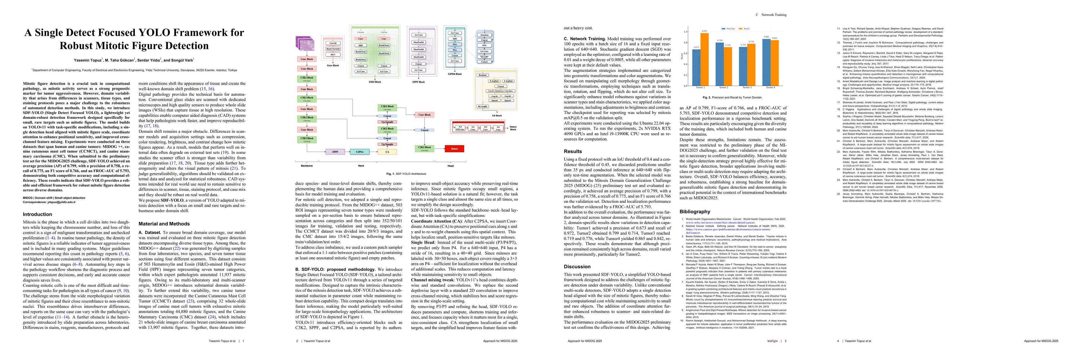 Mitotic figure detection is a crucial task in computational pathology, as mitotic activity serves as a strong prognostic marker for tumor aggressiveness. However, domain variability that arises from differences in scanners, tissue types, and staining protocols poses a major challenge to the robustness of automated detection methods. In this study, we introduce SDF-YOLO (Single Detect Focused YOLO), a lightweight yet domain-robust detection framework designed specifically for small, rare targets such as mitotic figures. The model builds on YOLOv11 with task-specific modifications, including a single detection head aligned with mitotic figure scale, coordinate attention to enhance positional sensitivity, and improved cross-channel feature mixing. Experiments were conducted on three datasets that span human and canine tumors: MIDOG ++, canine cutaneous mast cell tumor (CCMCT), and canine mammary carcinoma (CMC). When submitted to the preliminary test set for the MIDOG2025 challenge, SDF-YOLO achieved an average precision (AP) of 0.799, with a precision of 0.758, a recall of 0.775, an F1 score of 0.766, and an FROC-AUC of 5.793, demonstrating both competitive accuracy and computational efficiency. These results indicate that SDF-YOLO provides a reliable and efficient framework for robust mitotic figure detection across diverse domains.