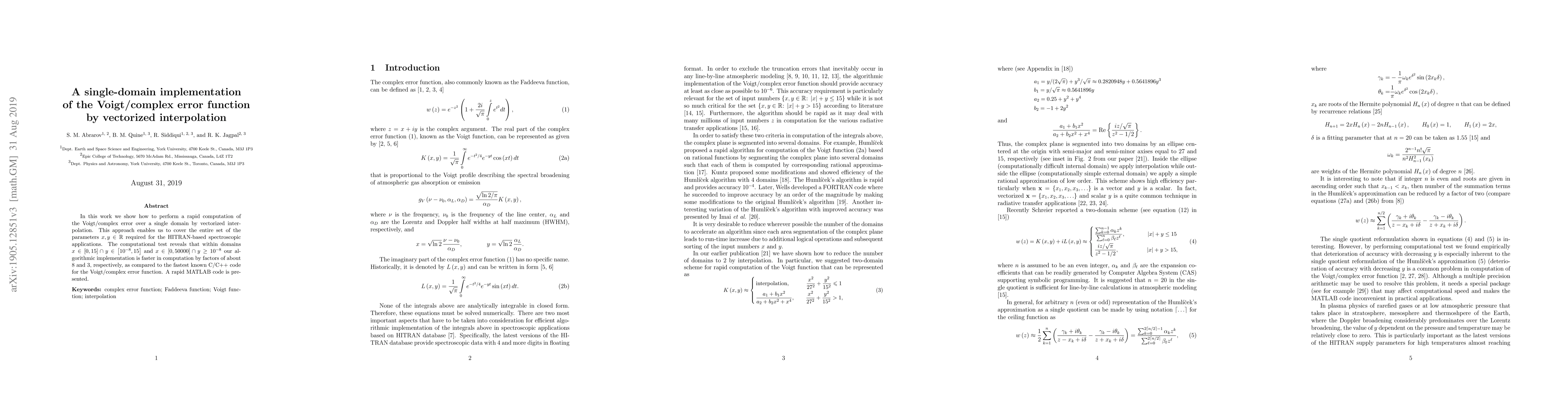 This paper presents an efficient single-domain implementation of the Voigt/complex error function using vectorized interpolation, significantly speeding up computations for HITRAN-based spectroscopic applications. The proposed method outperforms existing C/C++ codes by factors of 8 and 3 in specific parameter domains.