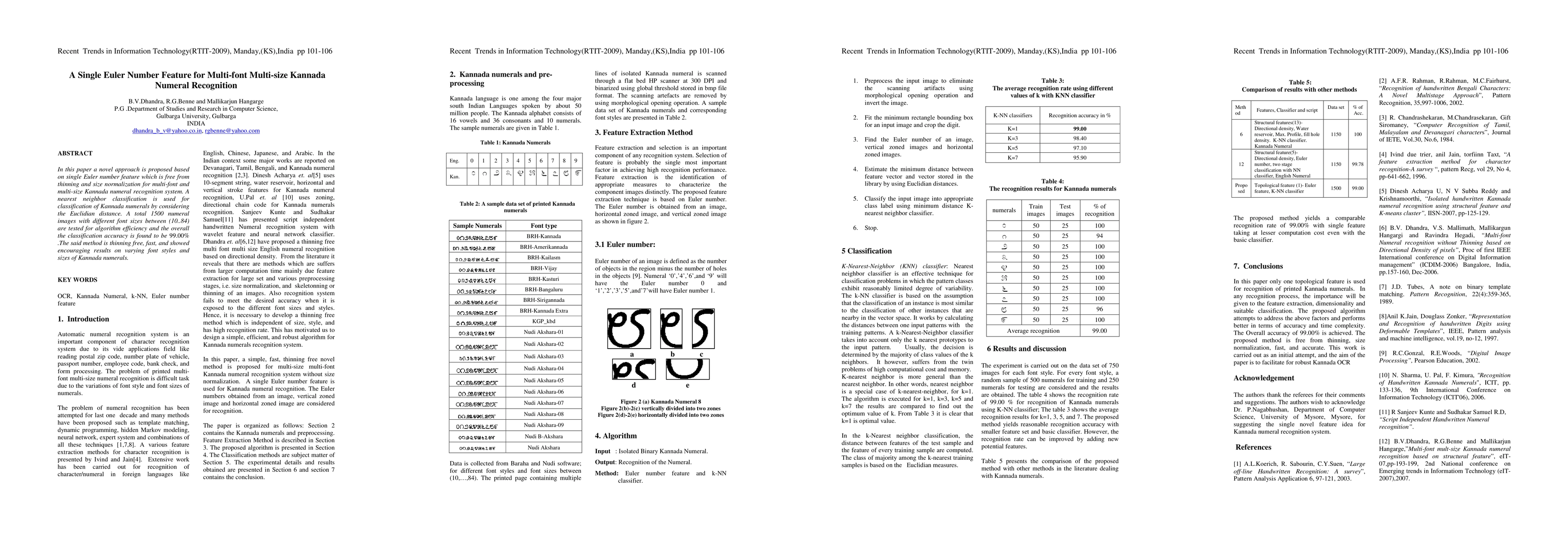 This paper proposes a novel recognition system for multi-font and multi-size Kannada numerals using a single Euler number feature, which avoids thinning and size normalization. The method achieves 99.00% classification accuracy using a nearest neighbor approach with Euclidean distance, demonstrating its effectiveness across varying font styles and sizes.