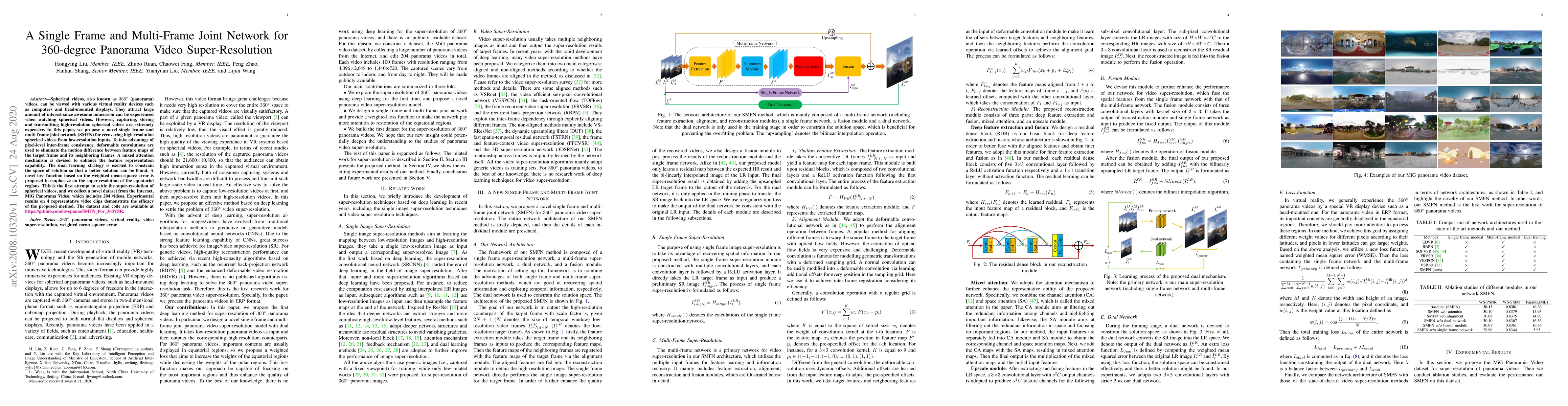 This paper proposes a novel single frame and multi-frame joint network (SMFN) to enhance the resolution of 360-degree spherical videos. The method employs deformable convolutions and a mixed attention mechanism to improve feature representation and inter-frame consistency, and a new loss function to focus on equatorial regions.