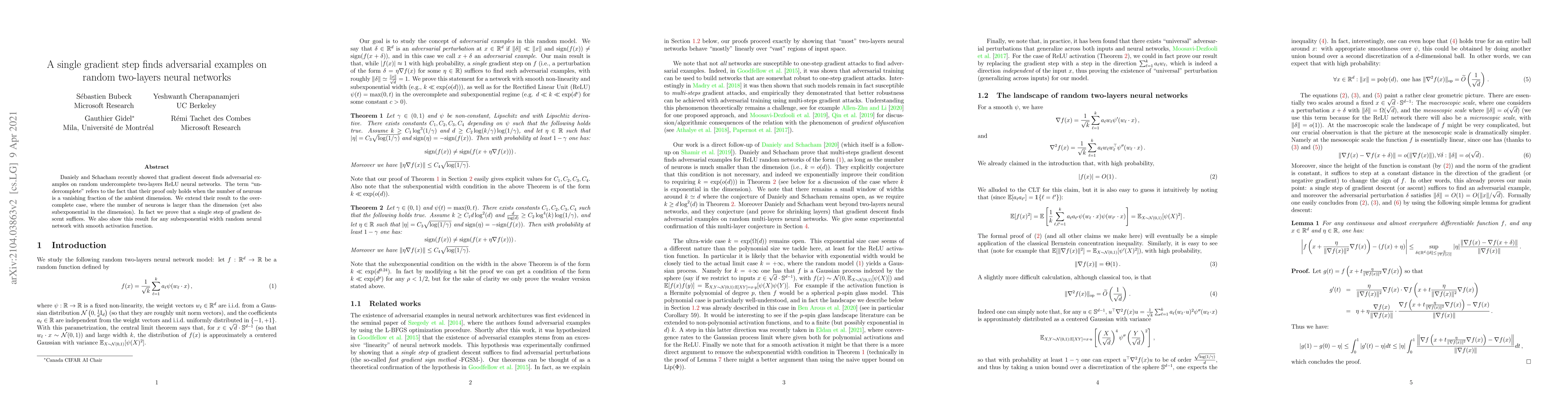 Researchers prove that a single gradient step is sufficient to find adversarial examples on certain types of neural networks, even when the number of neurons exceeds the network's dimension.