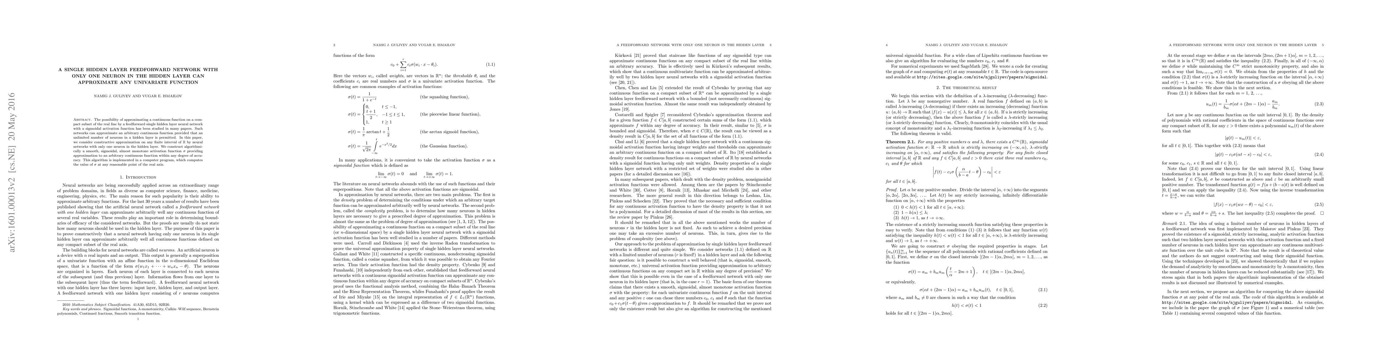 This paper demonstrates that a single hidden layer feedforward neural network with just one neuron can approximate any univariate continuous function on a finite interval, provided a specific smooth, sigmoidal, almost monotone activation function is used. The authors provide an algorithmic construction for this function and implement it in a computer program.