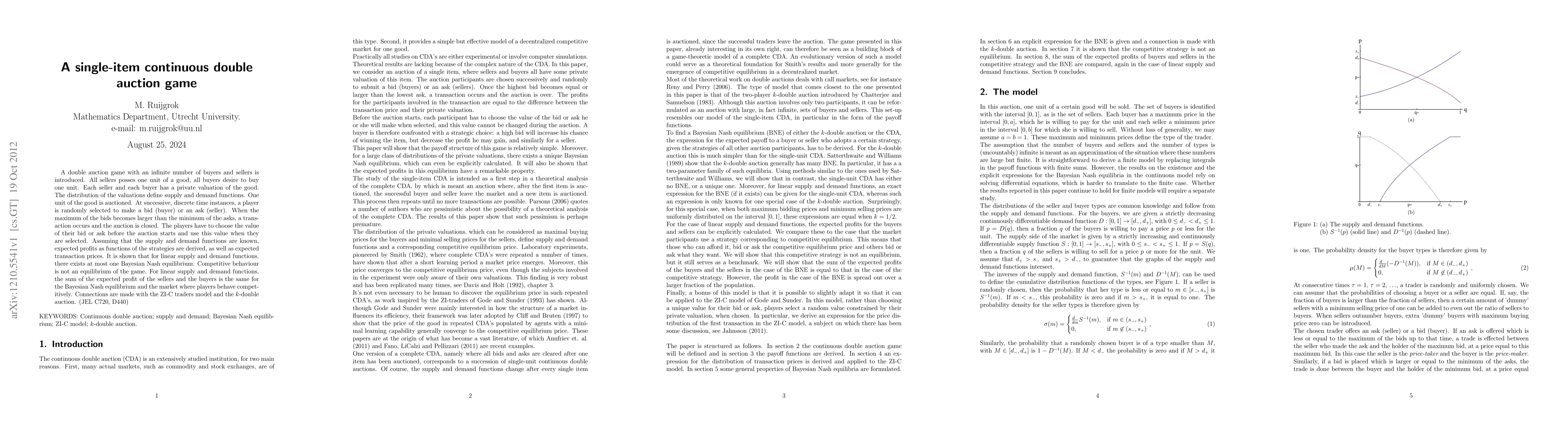 A double auction game with an infinite number of buyers and sellers is introduced. All sellers posses one unit of a good, all buyers desire to buy one unit. Each seller and each buyer has a private valuation of the good. The distribution of the valuations define supply and demand functions. One unit of the good is auctioned. At successive, discrete time instances, a player is randomly selected to make a bid (buyer) or an ask (seller). When the maximum of the bids becomes larger than the minimum of the asks, a transaction occurs and the auction is closed. The players have to choose the value of their bid or ask before the auction starts and use this value when they are selected. Assuming that the supply and demand functions are known, expected profits as functions of the strategies are derived, as well as expected transaction prices. It is shown that for linear supply and demand functions, there exists at most one Bayesian Nash equilibrium. Competitive behaviour is not an equilibrium of the game. For linear supply and demand functions, the sum of the expected profit of the sellers and the buyers is the same for the Bayesian Nash equilibrium and the market where players behave competitively. Connections are made with the ZI-C traders model and the $k$-double auction.