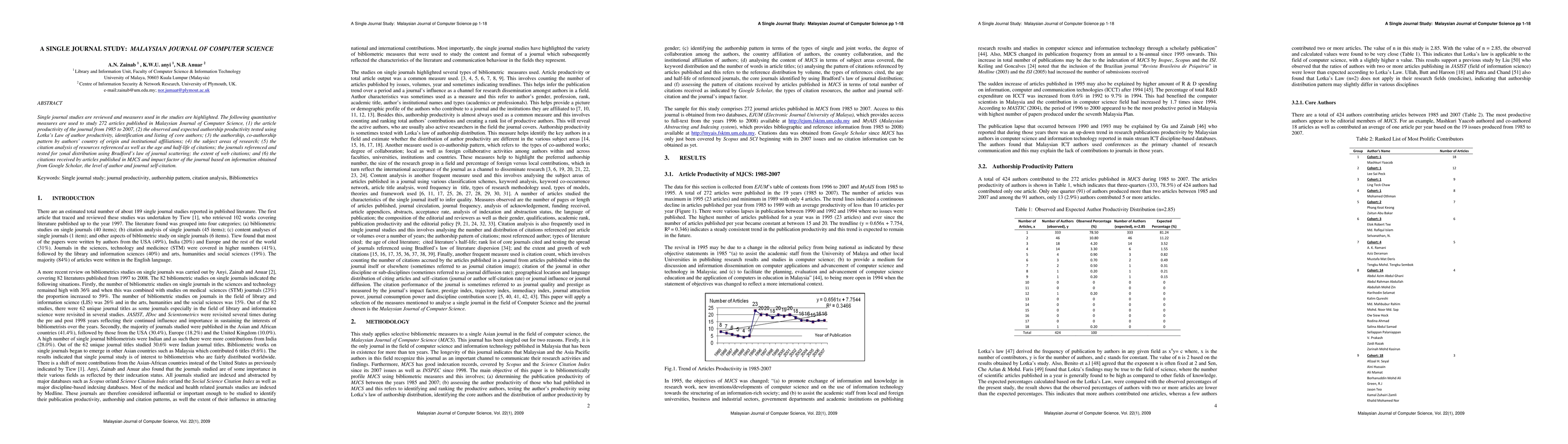 Single journal studies are reviewed and measures used in the studies are highlighted. The following quantitative measures are used to study 272 articles published in Malaysian Journal of Computer Science, (1) the article productivity of the journal from 1985 to 2007, (2) the observed and expected authorship productivity tested using Lotka's Law of author productivity, identification and listing of core authors; (3) the authorship, co-authorship pattern by authors' country of origin and institutional affiliations; (4) the subject areas of research; (5) the citation analysis of resources referenced as well as the age and half-life of citations; the journals referenced and tested for zonal distribution using Bradford's law of journal scattering; the extent of web citations; and (6) the citations received by articles published in MJCS and impact factor of the journal based on information obtained from Google Scholar, the level of author and journal self-citation.