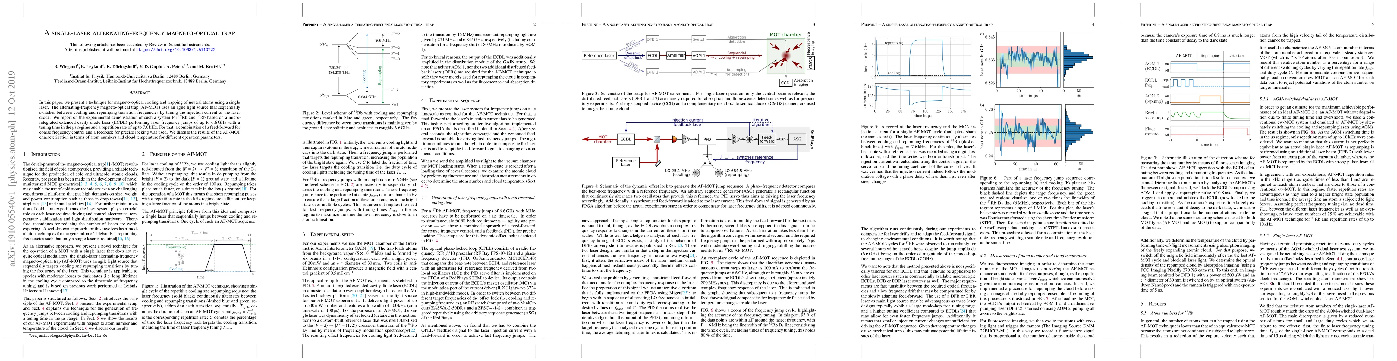 This paper introduces a single-laser alternating-frequency magneto-optical trap (AF-MOT) for cooling and trapping neutral atoms, demonstrated for 87Rb and 85Rb using a micro-integrated diode laser. The AF-MOT achieves frequency jumps of up to 6.6 GHz with microsecond tuning times, and the system combines feed-forward and feedback control for precise frequency management.