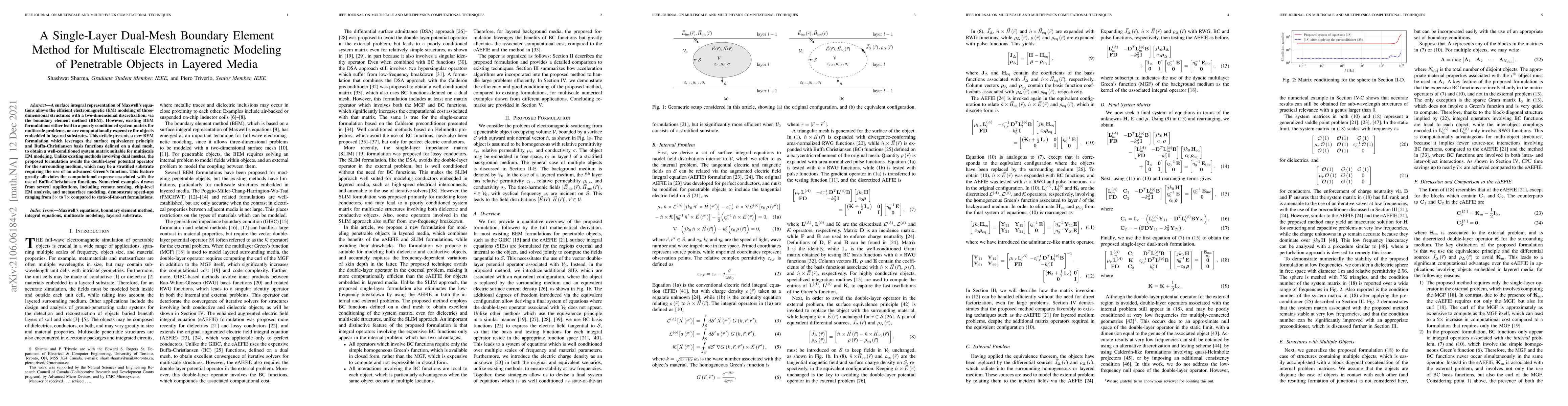 This paper introduces a novel single-layer dual-mesh boundary element method for efficient electromagnetic modeling of penetrable objects in layered media, achieving a well-conditioned system matrix and significant computational speed-ups over existing methods. The method avoids double-layer potentials, reducing computational costs and demonstrating speed-ups from 3x to 7x in various applications.