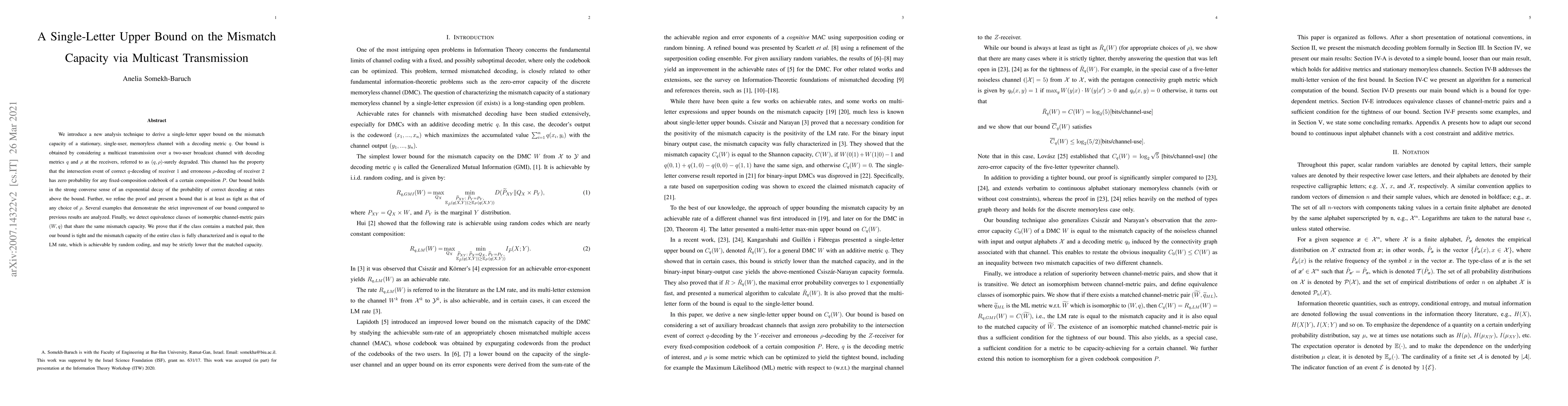 This research introduces a novel method to calculate an upper bound on the mismatch capacity of single-user channels using multicast transmission. The new bound, derived from a two-user broadcast channel, is shown to be tighter and more universally applicable than previous bounds, with examples demonstrating its improvement. The study also identifies equivalence classes of channel-metric pairs with shared mismatch capacity, which can be equal to the LM rate, achievable via random coding, and potentially lower than the matched capacity.