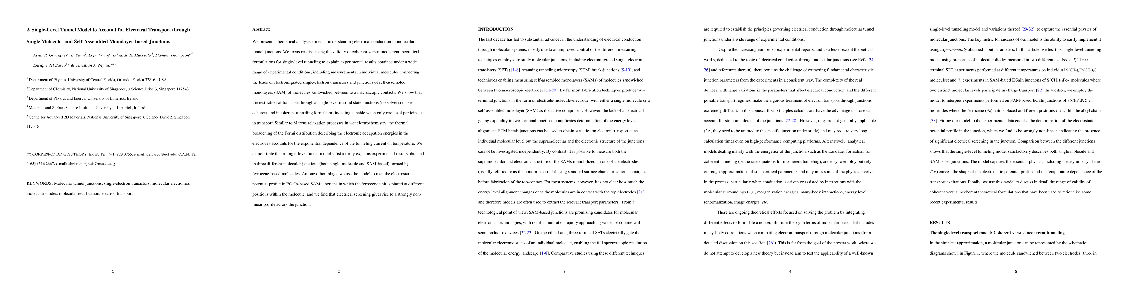This paper proposes a single-level tunnel model to explain electrical conduction in molecular junctions, showing that coherent and incoherent tunneling formalisms are indistinguishable when only one level is involved. The model successfully explains experimental results across various molecular junctions, including ferrocene-based single-molecule and self-assembled monolayer junctions.