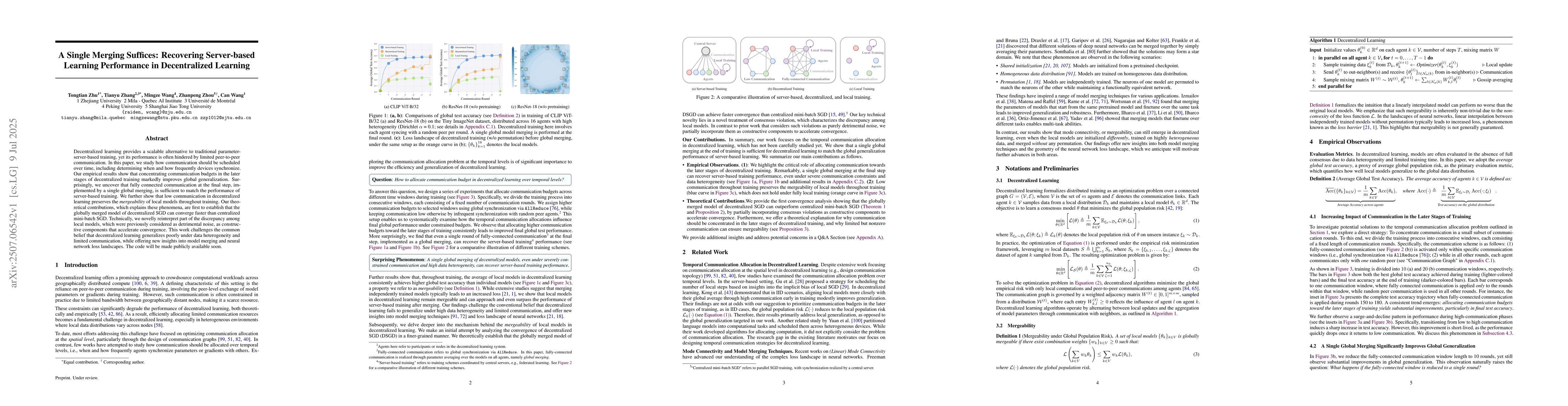 Decentralized learning provides a scalable alternative to traditional parameter-server-based training, yet its performance is often hindered by limited peer-to-peer communication. In this paper, we study how communication should be scheduled over time, including determining when and how frequently devices synchronize. Our empirical results show that concentrating communication budgets in the later stages of decentralized training markedly improves global generalization. Surprisingly, we uncover that fully connected communication at the final step, implemented by a single global merging, is sufficient to match the performance of server-based training. We further show that low communication in decentralized learning preserves the \textit{mergeability} of local models throughout training. Our theoretical contributions, which explains these phenomena, are first to establish that the globally merged model of decentralized SGD can converge faster than centralized mini-batch SGD. Technically, we novelly reinterpret part of the discrepancy among local models, which were previously considered as detrimental noise, as constructive components that accelerate convergence. This work challenges the common belief that decentralized learning generalizes poorly under data heterogeneity and limited communication, while offering new insights into model merging and neural network loss landscapes.