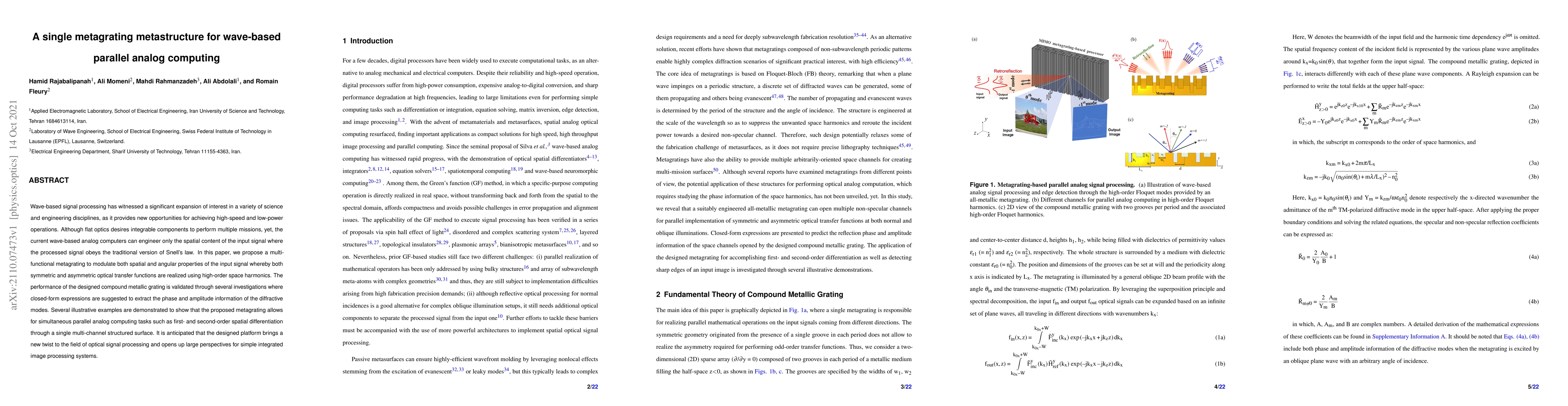 This paper proposes a versatile metagrating metastructure that modulates both spatial and angular properties of wave-based signals, enabling parallel analog computing tasks such as first- and second-order spatial differentiation. The designed metallic grating is validated through investigations, suggesting it could revolutionize optical signal processing and simplify integrated image processing systems.