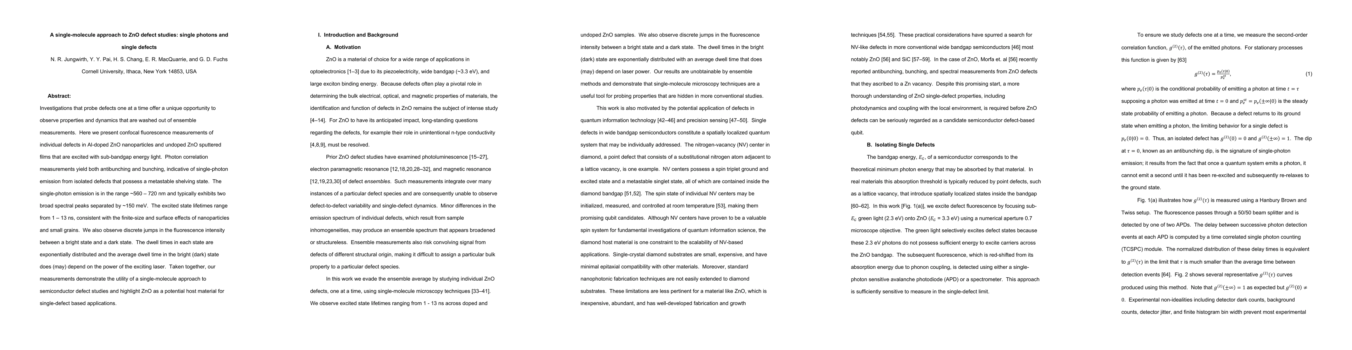 This paper investigates individual defects in ZnO using confocal fluorescence and single-photon emission techniques, revealing metastable shelving states and spectral peaks. The study highlights ZnO's potential for single-defect applications and demonstrates the advantages of single-molecule analysis over ensemble measurements.