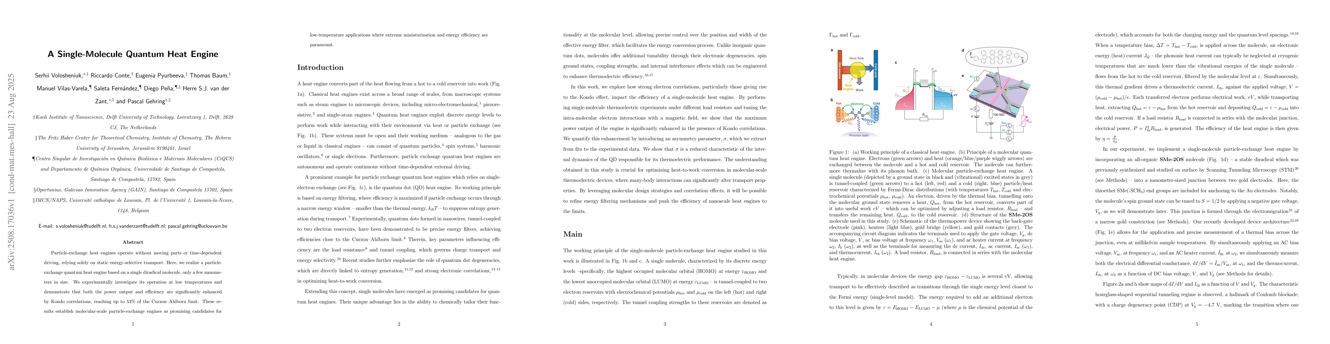 Particle-exchange heat engines operate without moving parts or time-dependent driving, relying solely on static energy-selective transport. Here, we realize a particle-exchange quantum heat engine based on a single diradical molecule, only a few nanometers in size. We experimentally investigate its operation at low temperatures and demonstrate that both the power output and efficiency are significantly enhanced by Kondo correlations, reaching up to 53 % of the Curzon-Ahlborn limit. These results establish molecular-scale particle-exchange engines as promising candidates for low-temperature applications where extreme miniaturization and energy efficiency are paramount.
